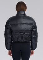 The Sandbanks Women's Monogram Cropped Puffer/Gilet jacket is featured with a black shiny shell fabric, with removable sleeves transforming into a statement gilet. This jacket features shiny black engraved components, branded tonal elastic, contrast felt badge with rubber logo badge, fleece lined pockets and Sandbanks Monogram baffles.