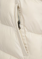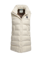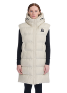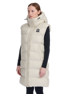 Sandbanks Shell Bay hooded long gilet for women in stone, made from luxury Italian fabrics and components. This high thermal retention gilet has a statement contrast brown lining, high neck hood for warmth and features our signature Sandbanks contrast placket embroidery, swirl embroidered chest badge logo and polar fleece lined zip side pockets.