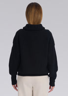 Sandbanks half zip knitted jumper in black, made from an extra fine merino wool for a cosy feel. This luxury jumper features a funnel neck with silver Lampo half zip, engraved Sandbanks zip puller and embroidered sleeve badge logo.