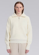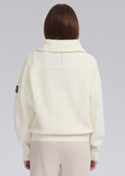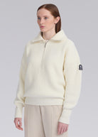 Sandbanks half zip knitted jumper in ecru, made from an extra fine merino wool for a cosy feel. This luxury jumper features a funnel neck with silver Lampo half zip, engraved Sandbanks zip puller and embroidered sleeve badge logo.