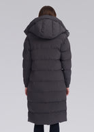 Sandbanks Haven oversized long puffer jacket for women is made almost entirely from recycled plastic bottles. With a charcoal outer shell fabric, this jacket has high thermal retention, and features statement Sandbanks embroidery details.
