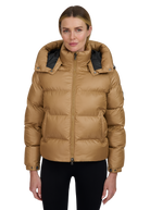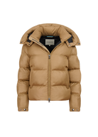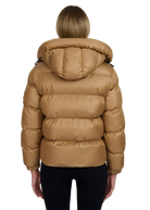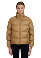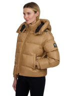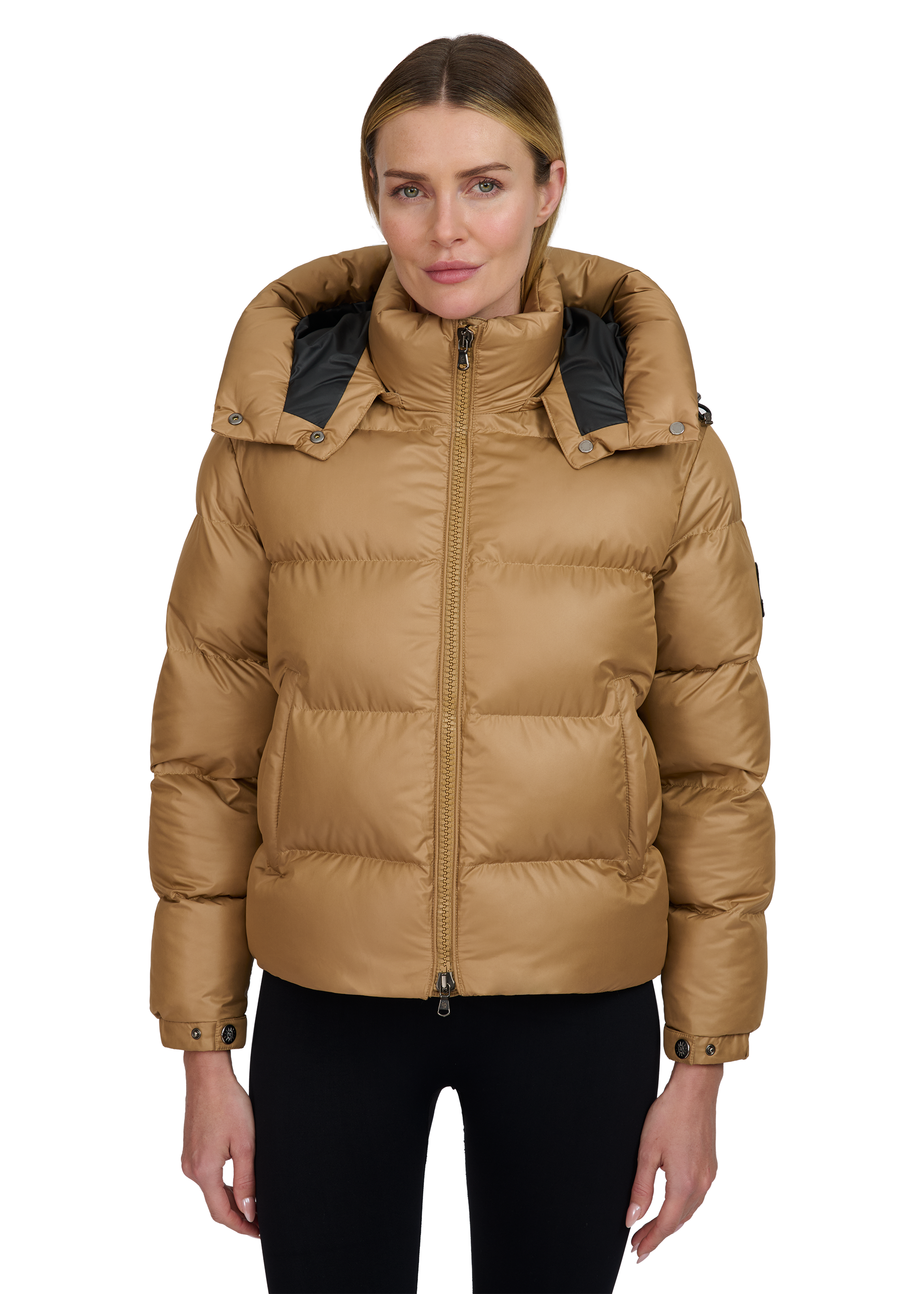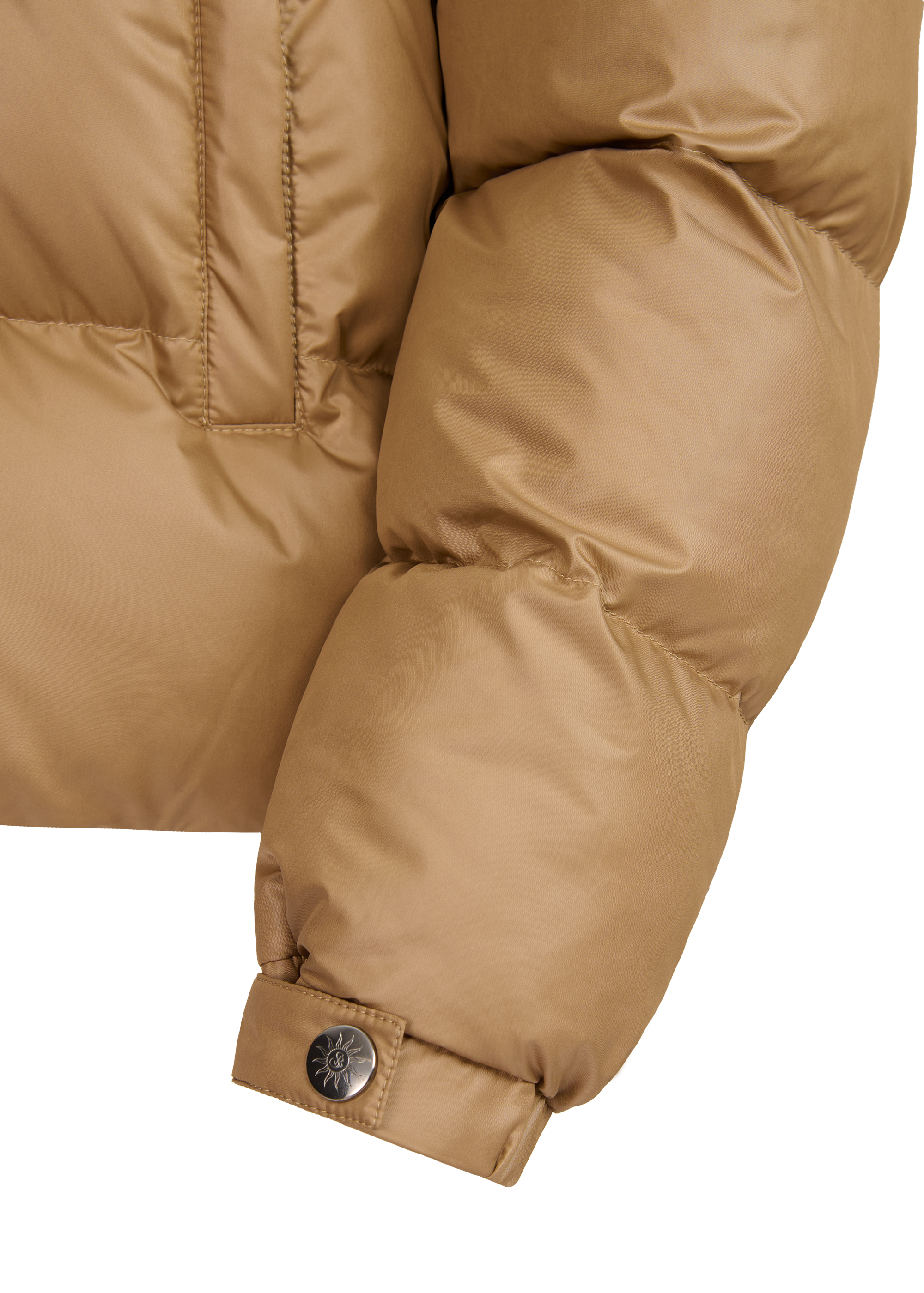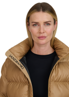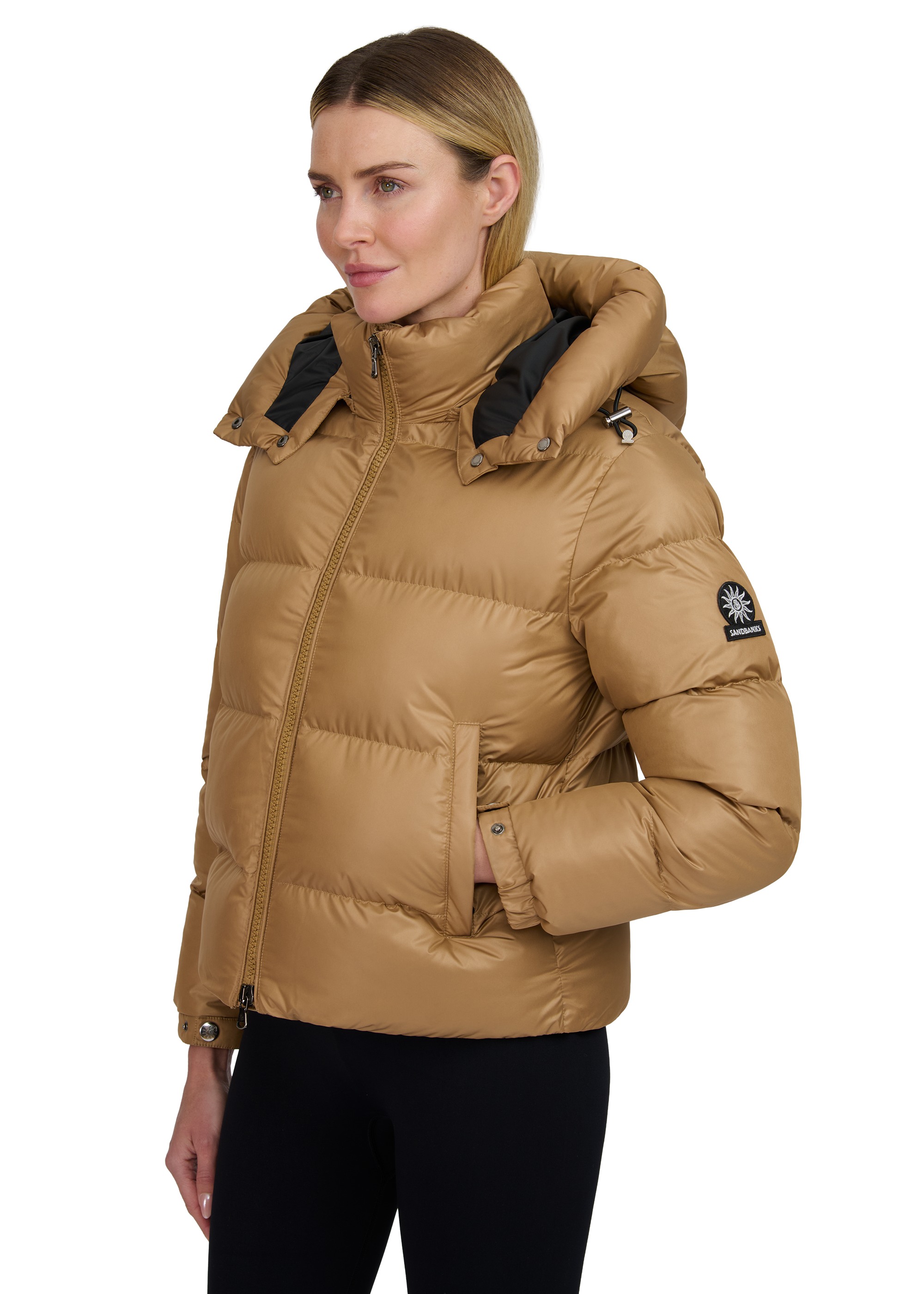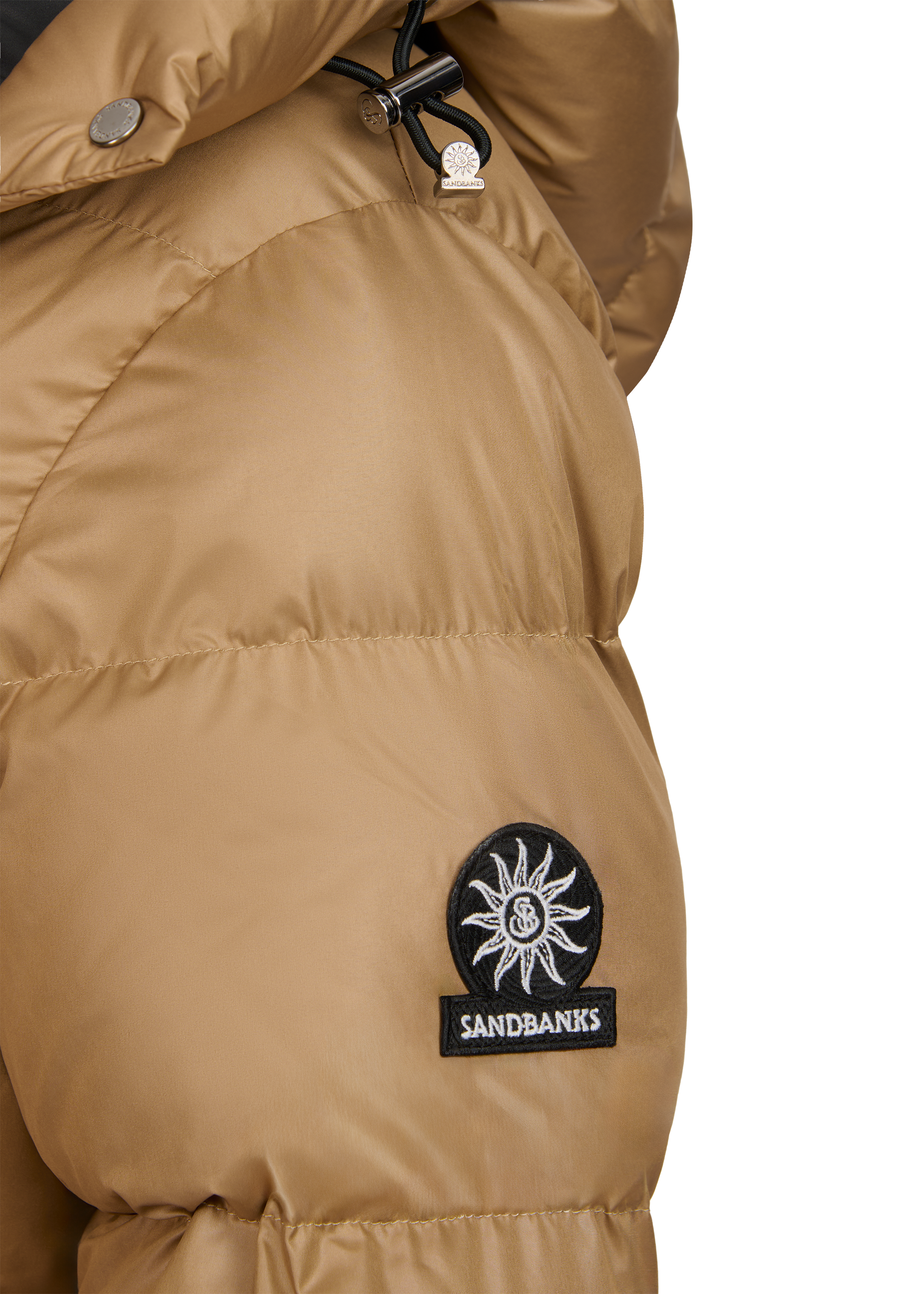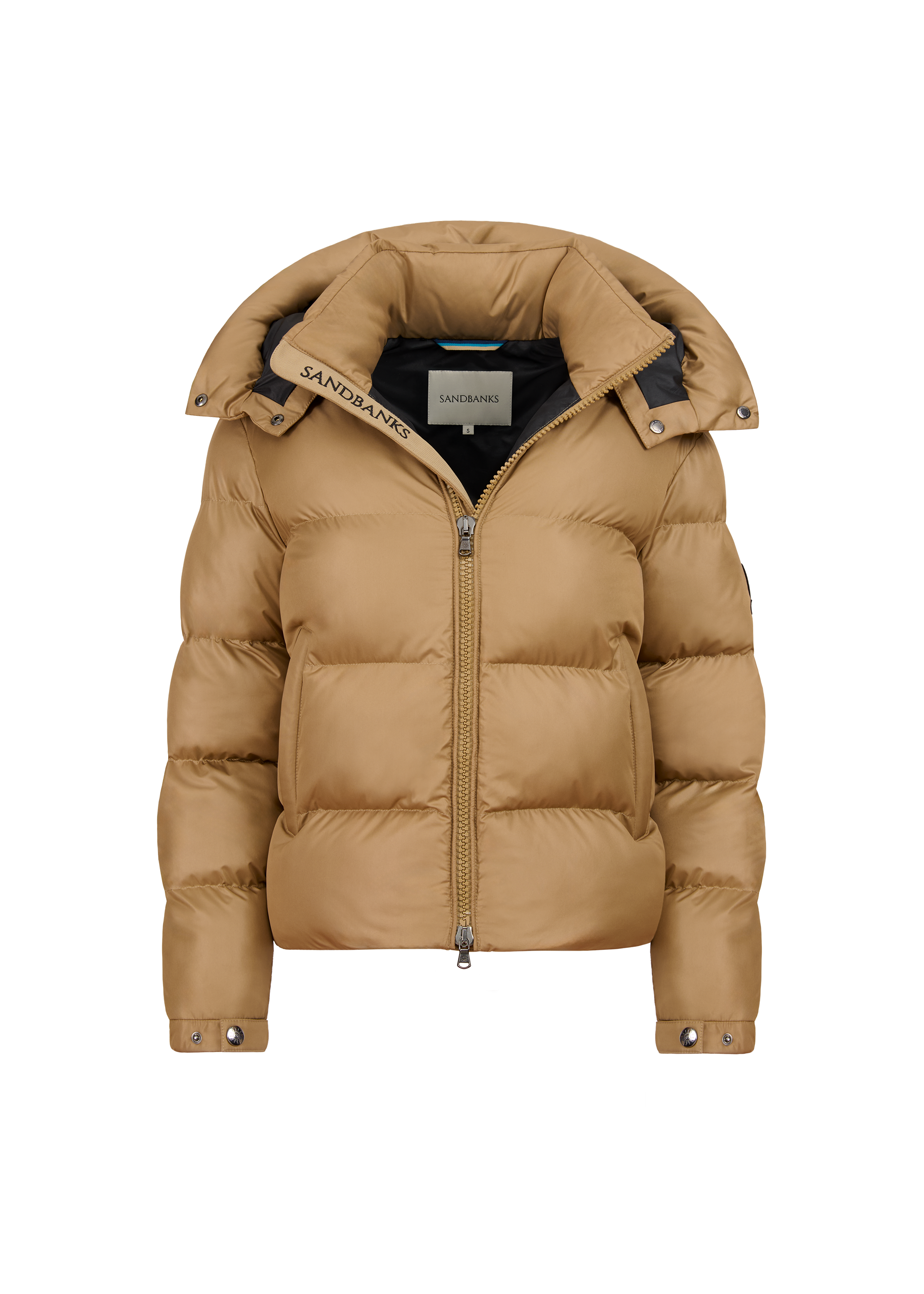 Sandbanks Aurora puffer jacket for women in gold, crafted from lightweight Italian fabric made from recycled polyester and filled with eco-down made from recycled plastic bottles. This women's short puffer features a contrast colour lining, Lampo Italian 2-way central zip, side zip pockets with fleece lining, removable hood, elasticated hem, adjustable cuffs, gun metal components, embroidered Sandbanks logo placket and embroidered badge logo.