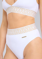 Sandbanks women's monogram jacquard bikini top, made from a polyamide and elastane blend for a luxurious feel with stretch, designed with a flattering deep triangle cut and supportive fit. Finished with Italian white and gold elasticated under band, with the Sandbanks monogram encapsulating our brand essence from a new perspective through its innovative and sophisticated design. The monogram was curated through repetition of our signature badge logo, presenting Sandbanks in a horizon formation.