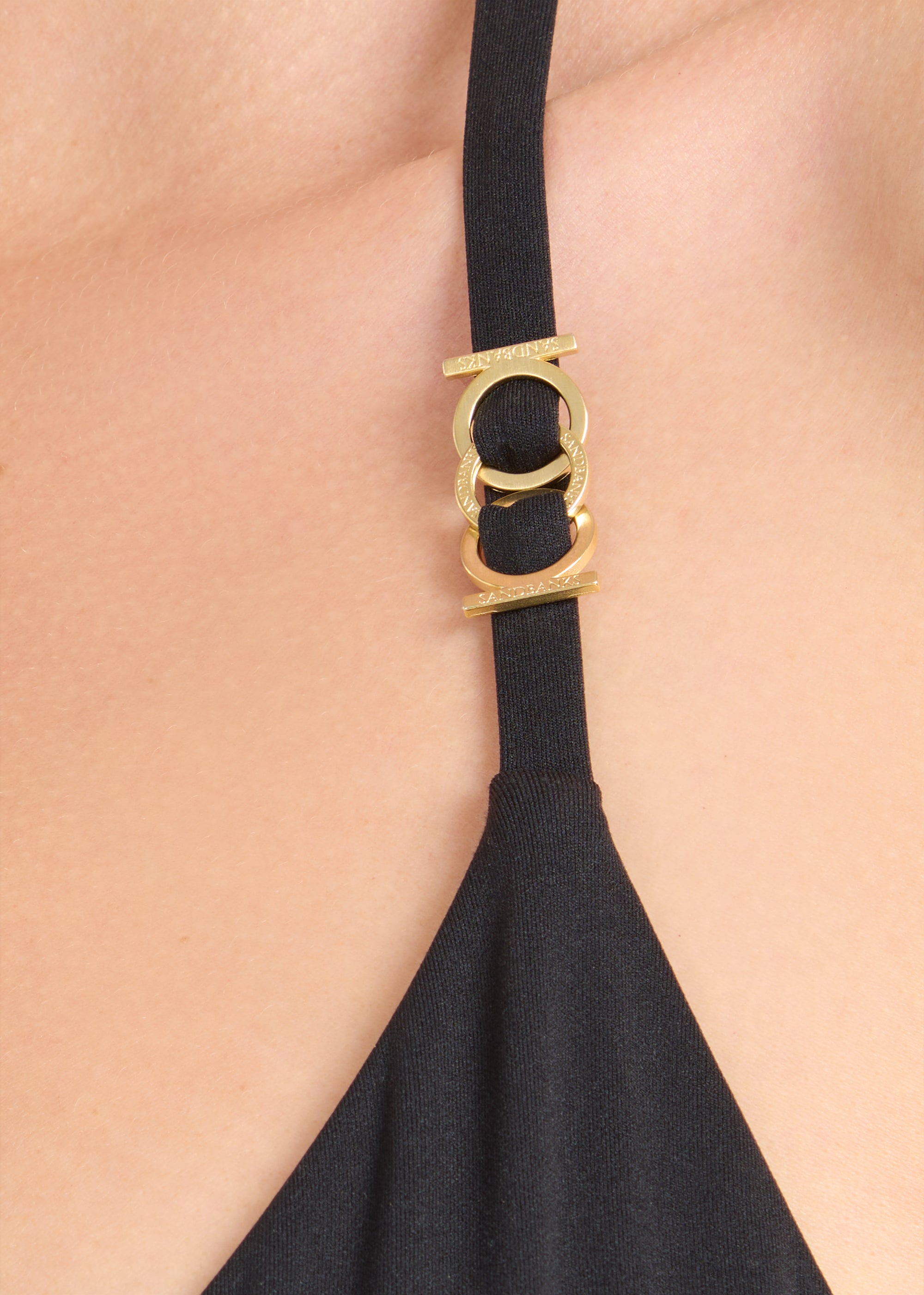 Sandbanks women's triangle bikini top, made from a polyamide and elastane blend for a luxurious feel with stretch. This classic triangle style is fully adjustable with elasticated tie up neck and back, finished with Italian brushed gold rings with Sandbanks engraving, curating the monogram in an innovative and sophisticated design.