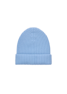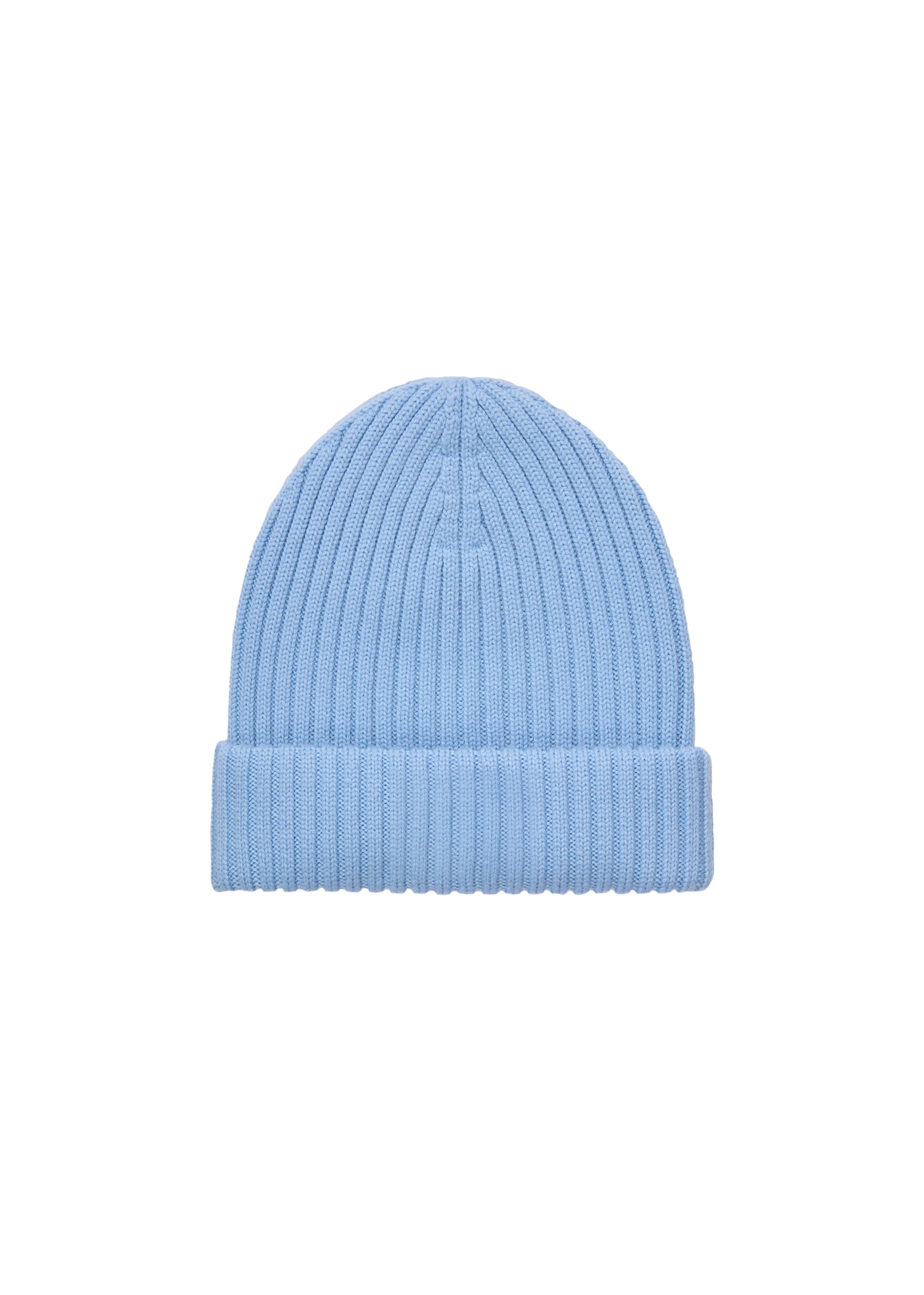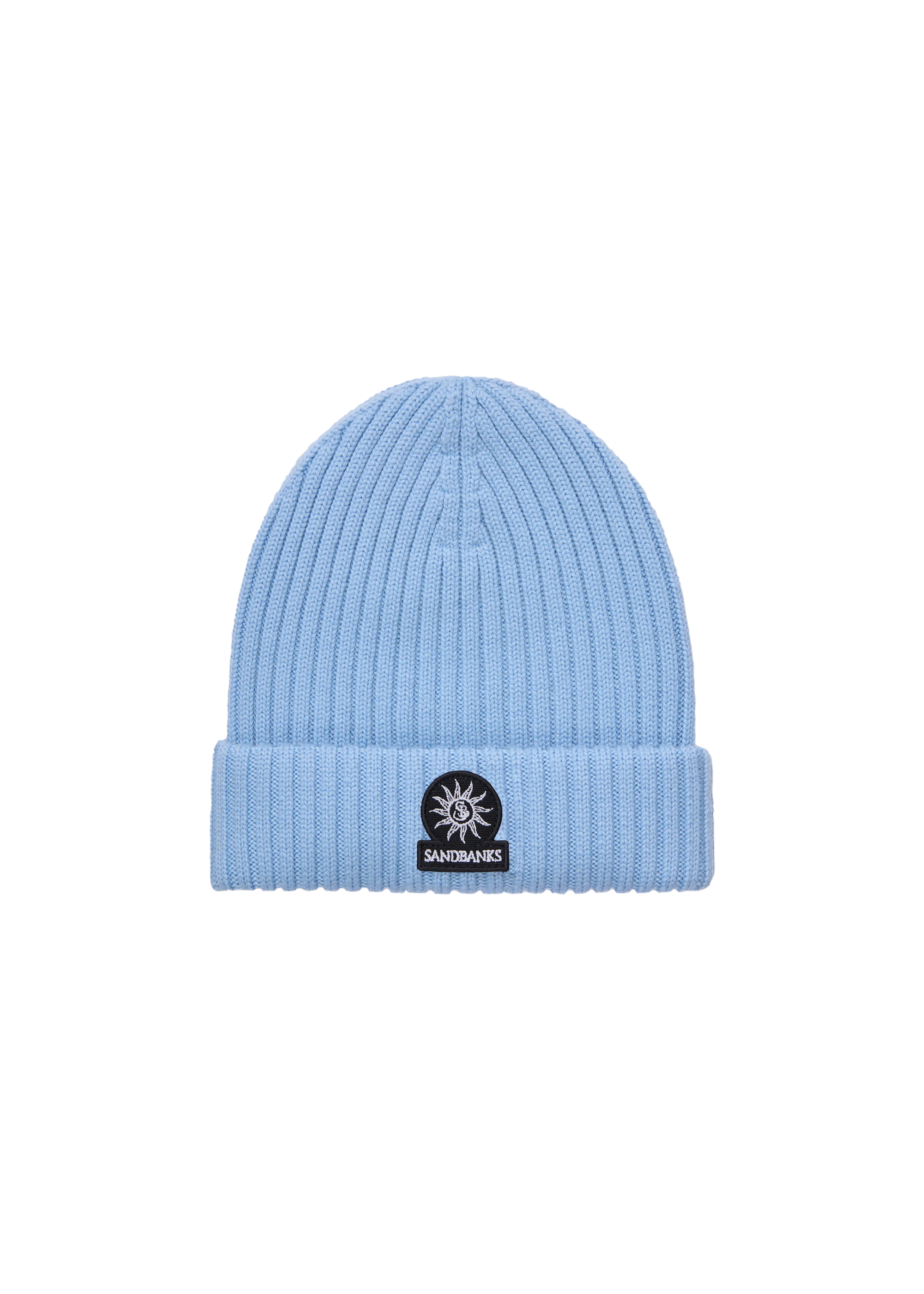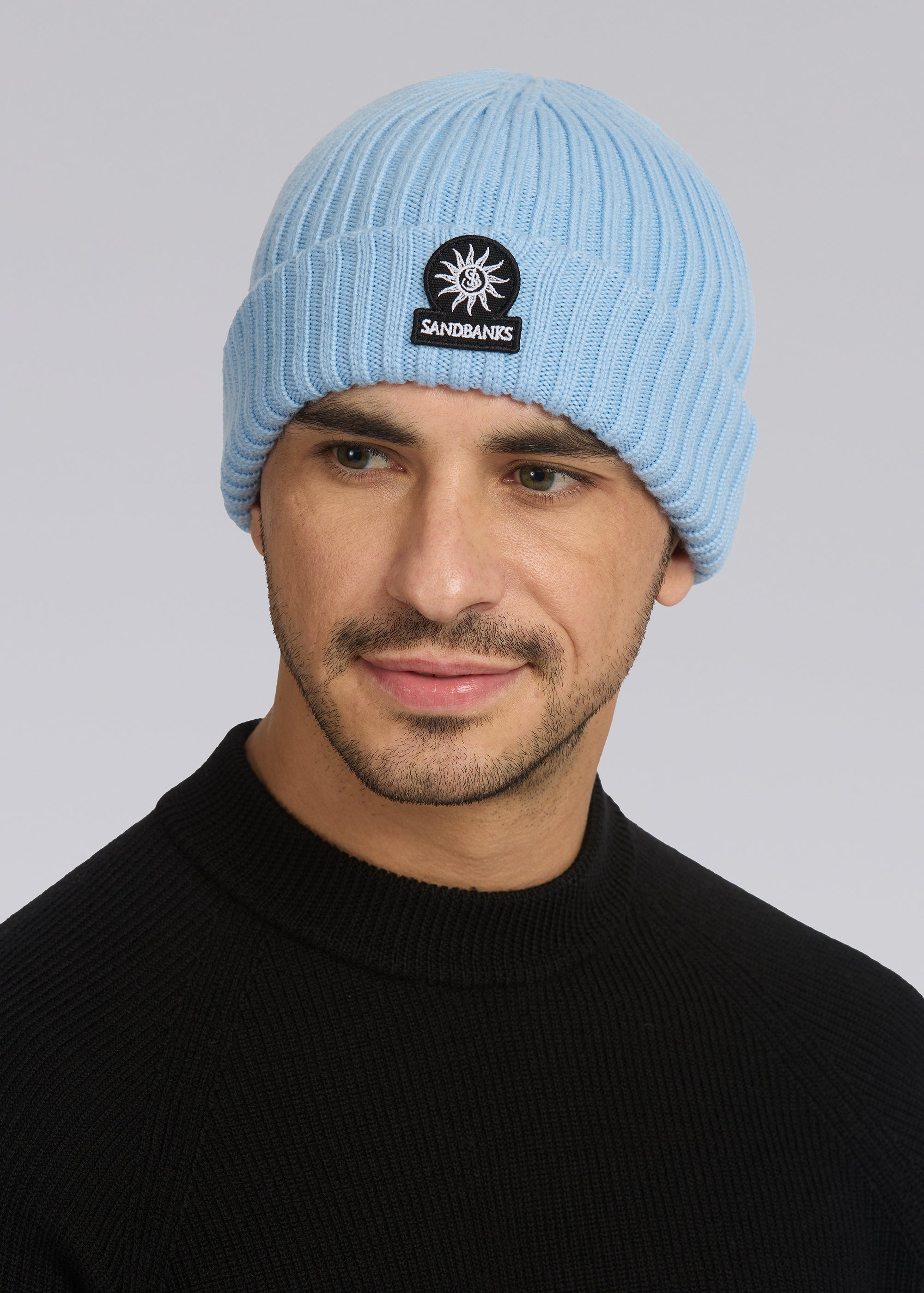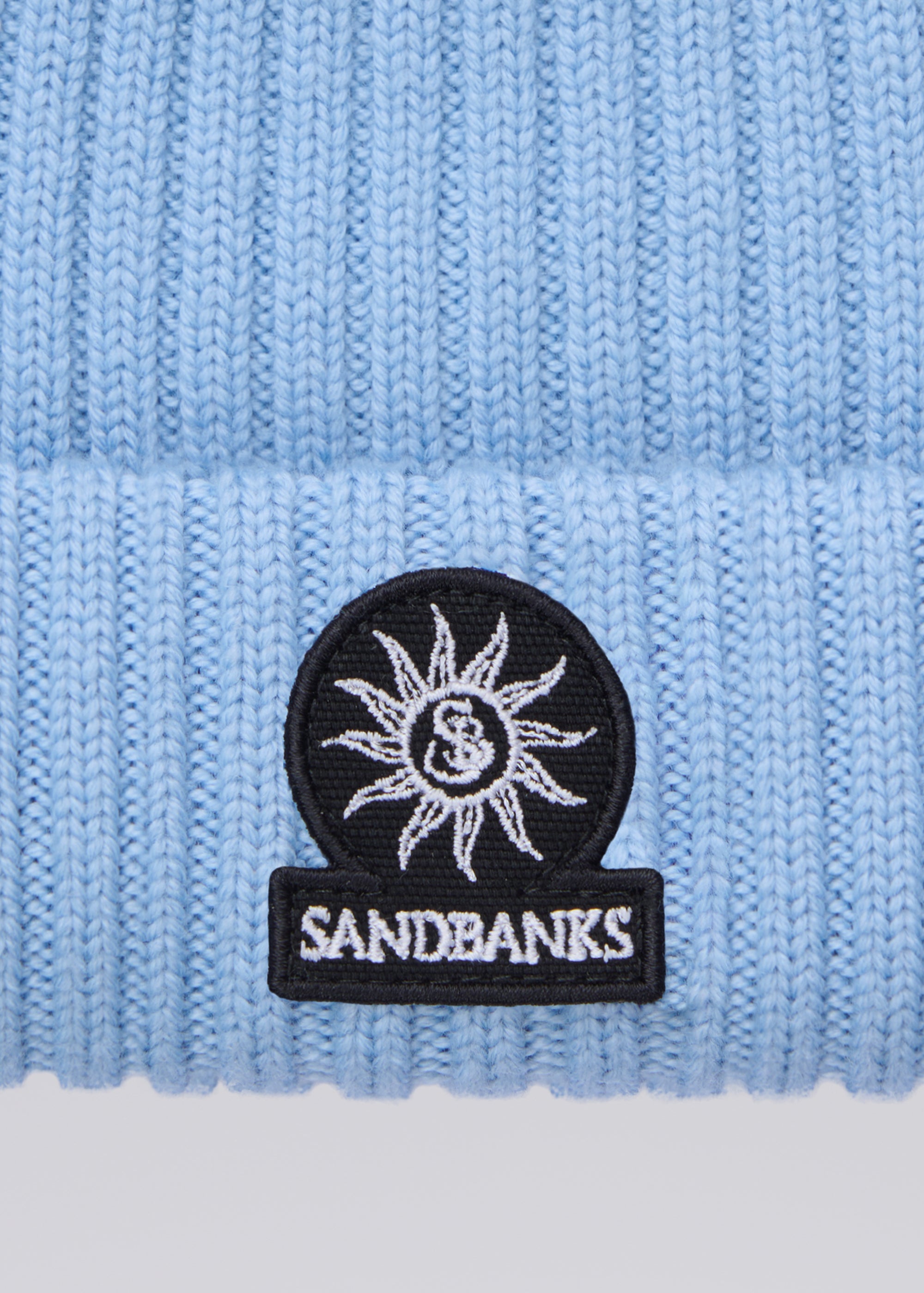 Sandbanks knitted badge logo beanie in crystal blue, made from 100% Merino wool . Merino wool is known for its softness, warmth, and moisture-wicking properties, making it the perfect material for a comfortable and functional beanie.