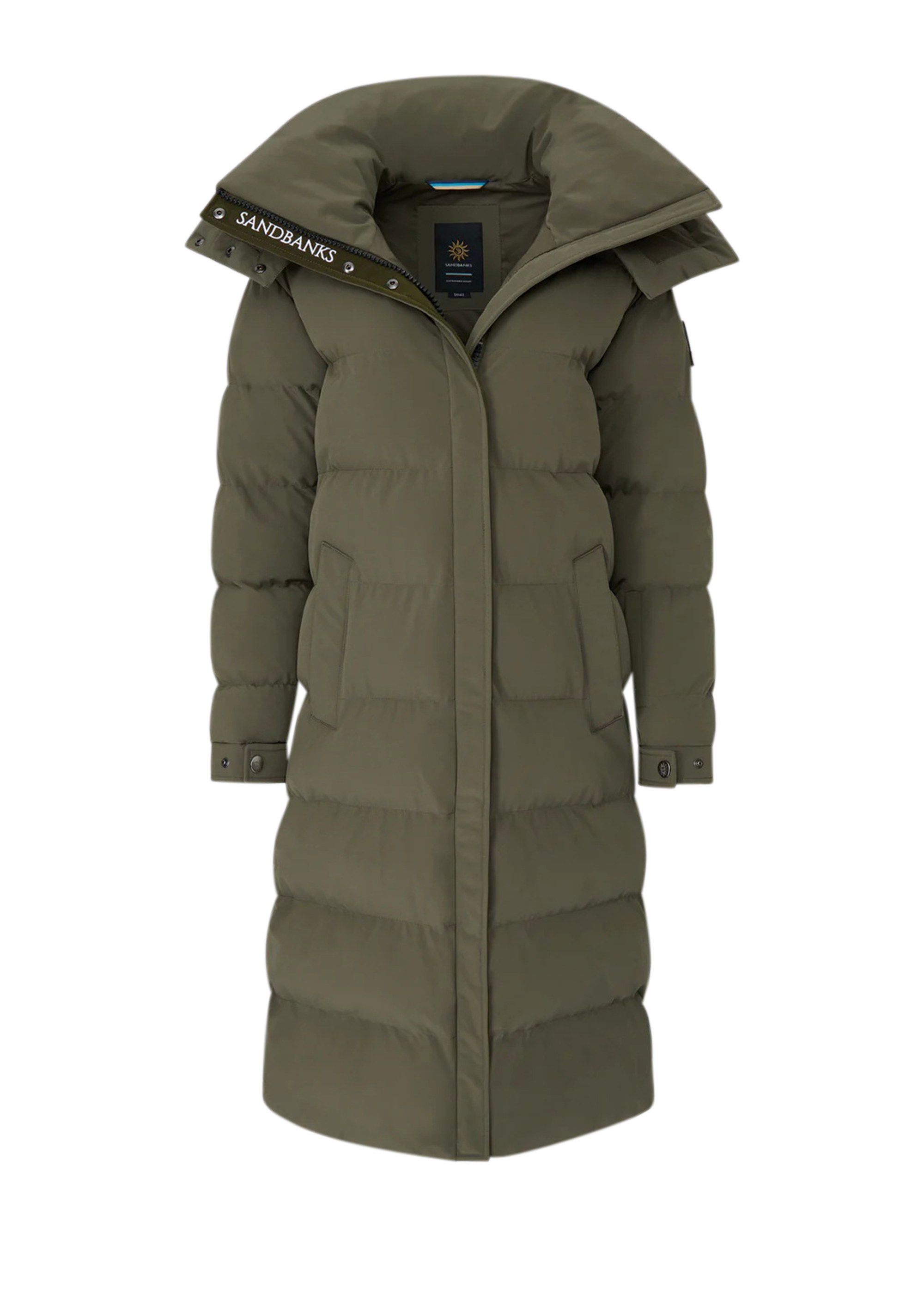 Sandbanks Haven oversized long puffer jacket for women is made almost entirely from recycled plastic bottles. With a khaki outer shell fabric, this jacket has high thermal retention, and features statement Sandbanks embroidery details.