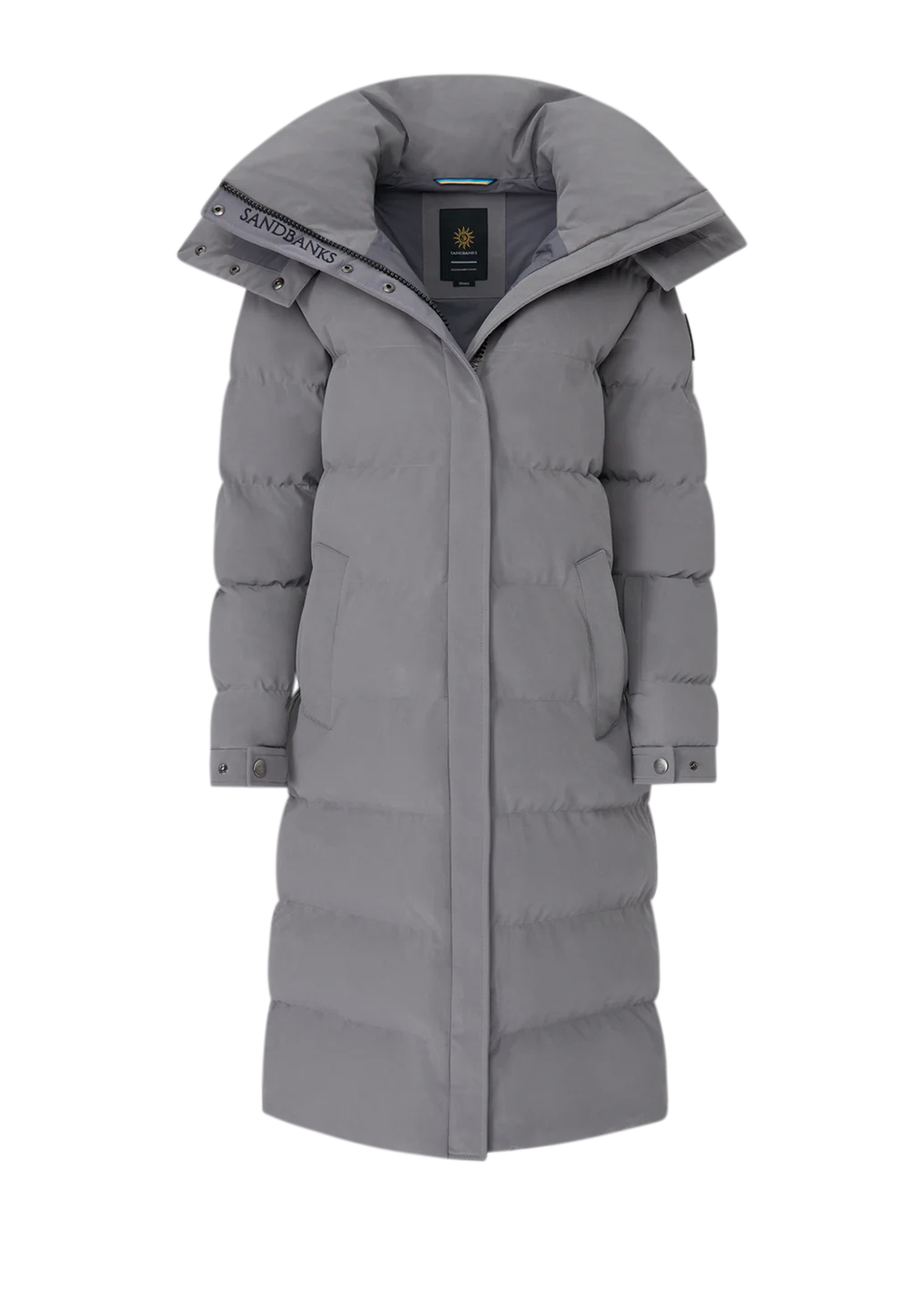 Sandbanks Haven oversized long puffer jacket for women is made almost entirely from recycled plastic bottles. With a light grey outer shell fabric, this jacket has high thermal retention, and features statement Sandbanks embroidery details.