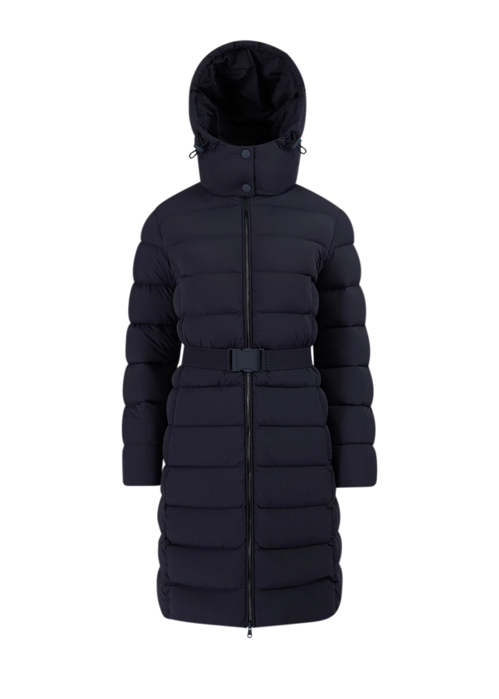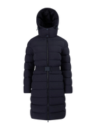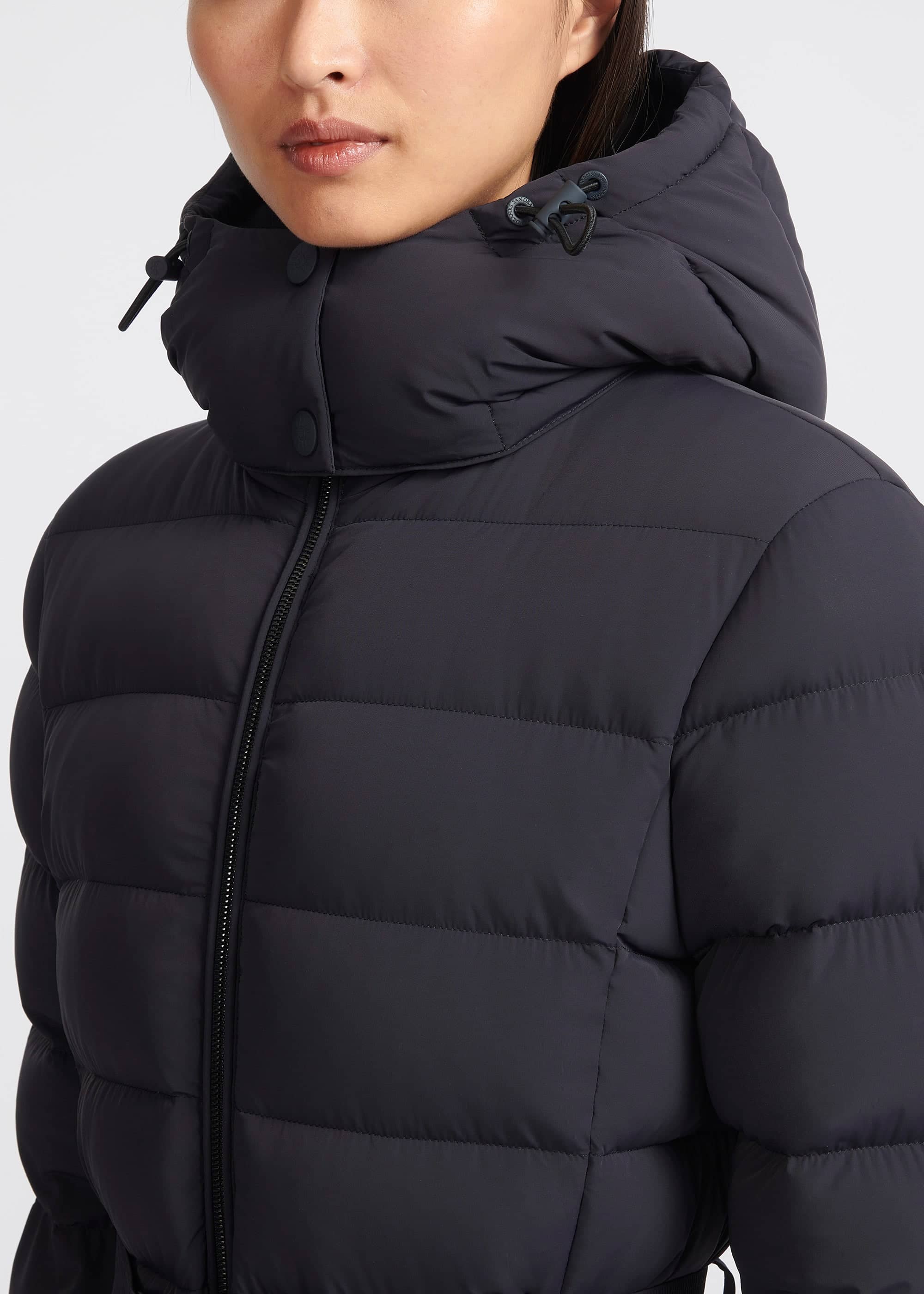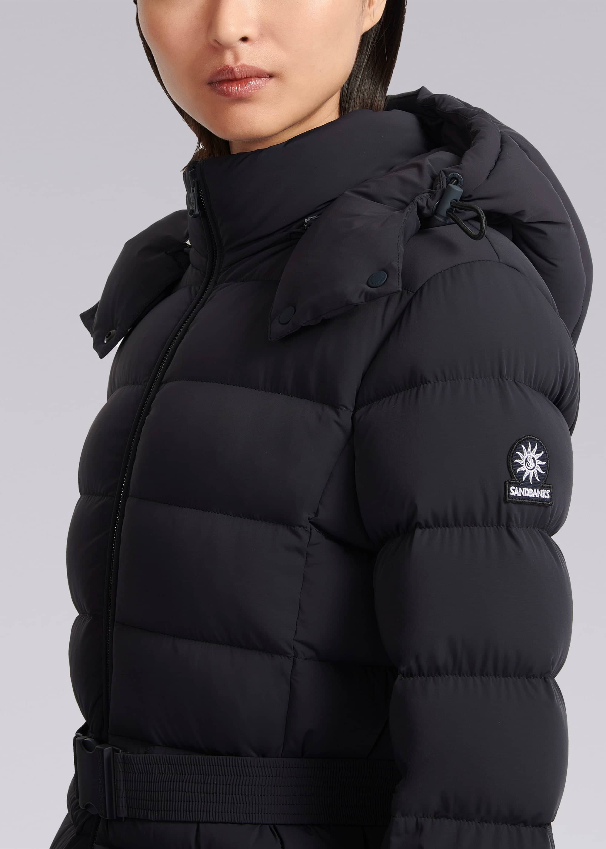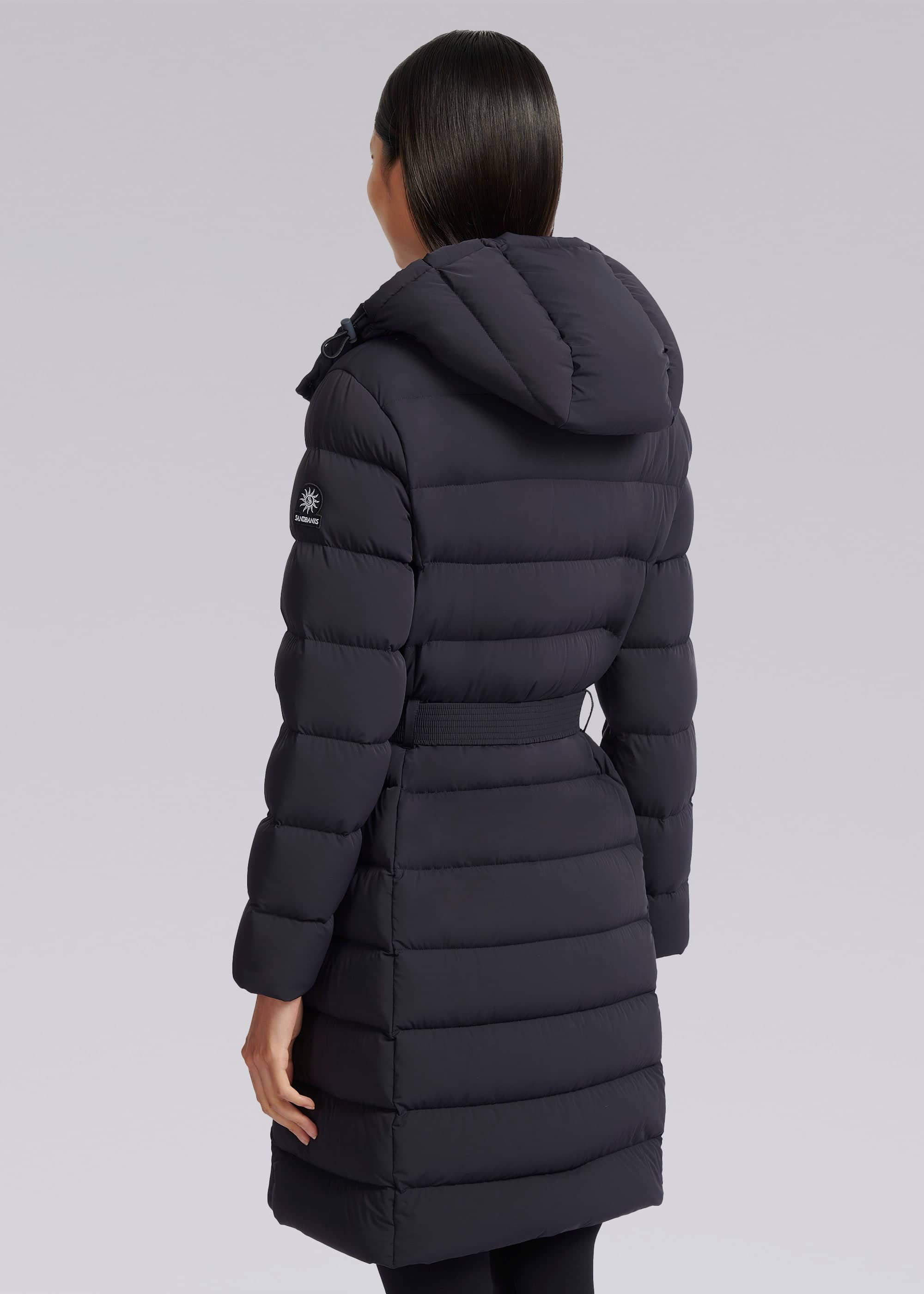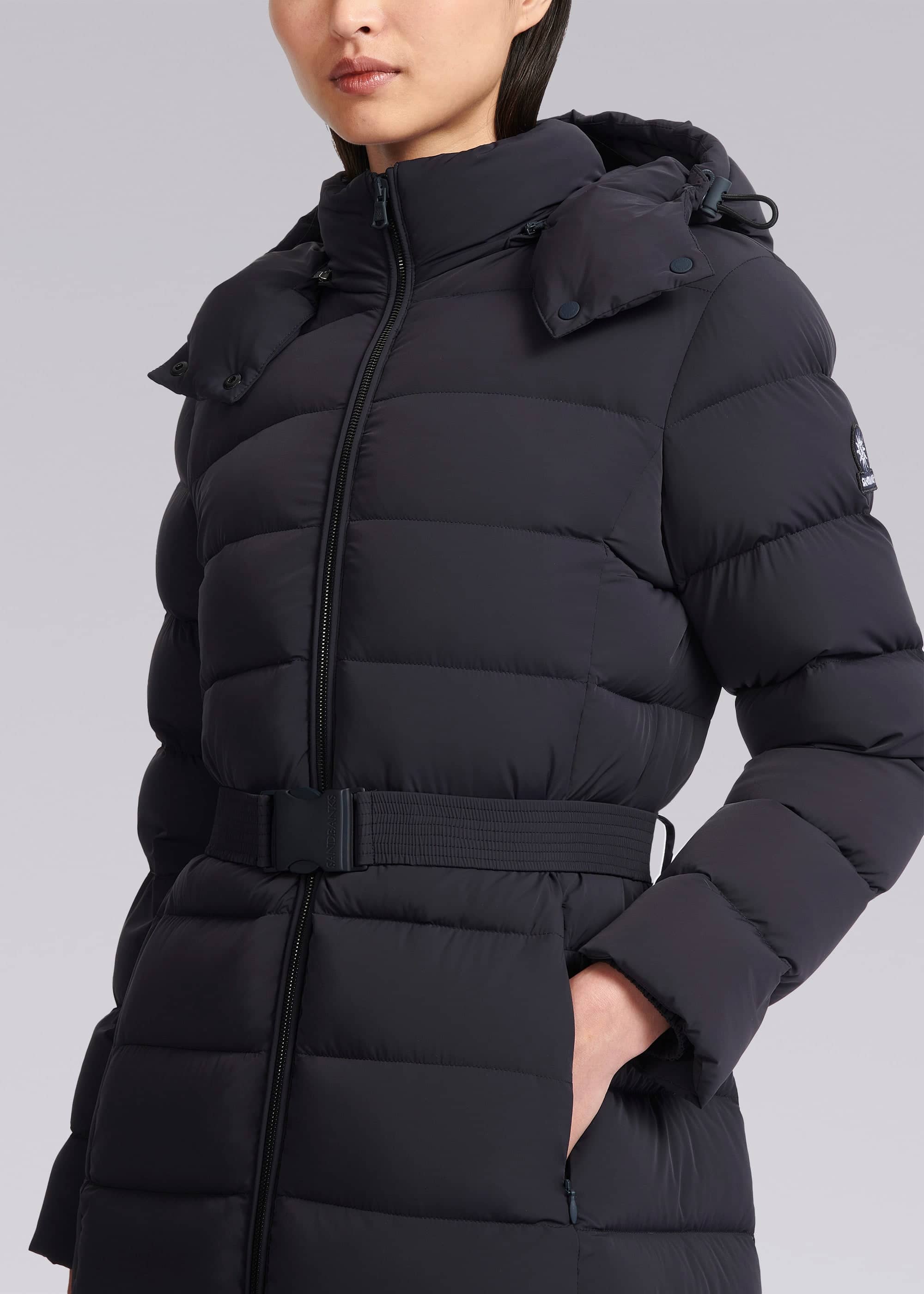 Sandbanks women's belted mid puffer in navy, a lightweight recycled natural down filled puffer jacket made from a lustrous soft shell 4-way stretch water resistant fabric. This jacket benefits from a removable zip off hood, cosy fleece lined pockets and elasticated belt with metal laser engraved clasp in a rubberised finish.