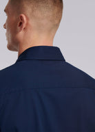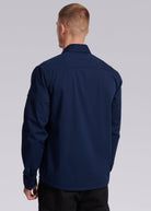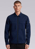 Sandbanks men's Gabardine Zip Overshirt in navy, made from a organic cotton stretch gabardine with a soft and luxurious handle. This overshirt features a Sandbanks logo badge embroidery on the sleeve, metal YKK zip in black with enamel branded pullers, tri-colour neck binding, chest pockets, side entry pockets and black rubberised buttons on the cuffs.