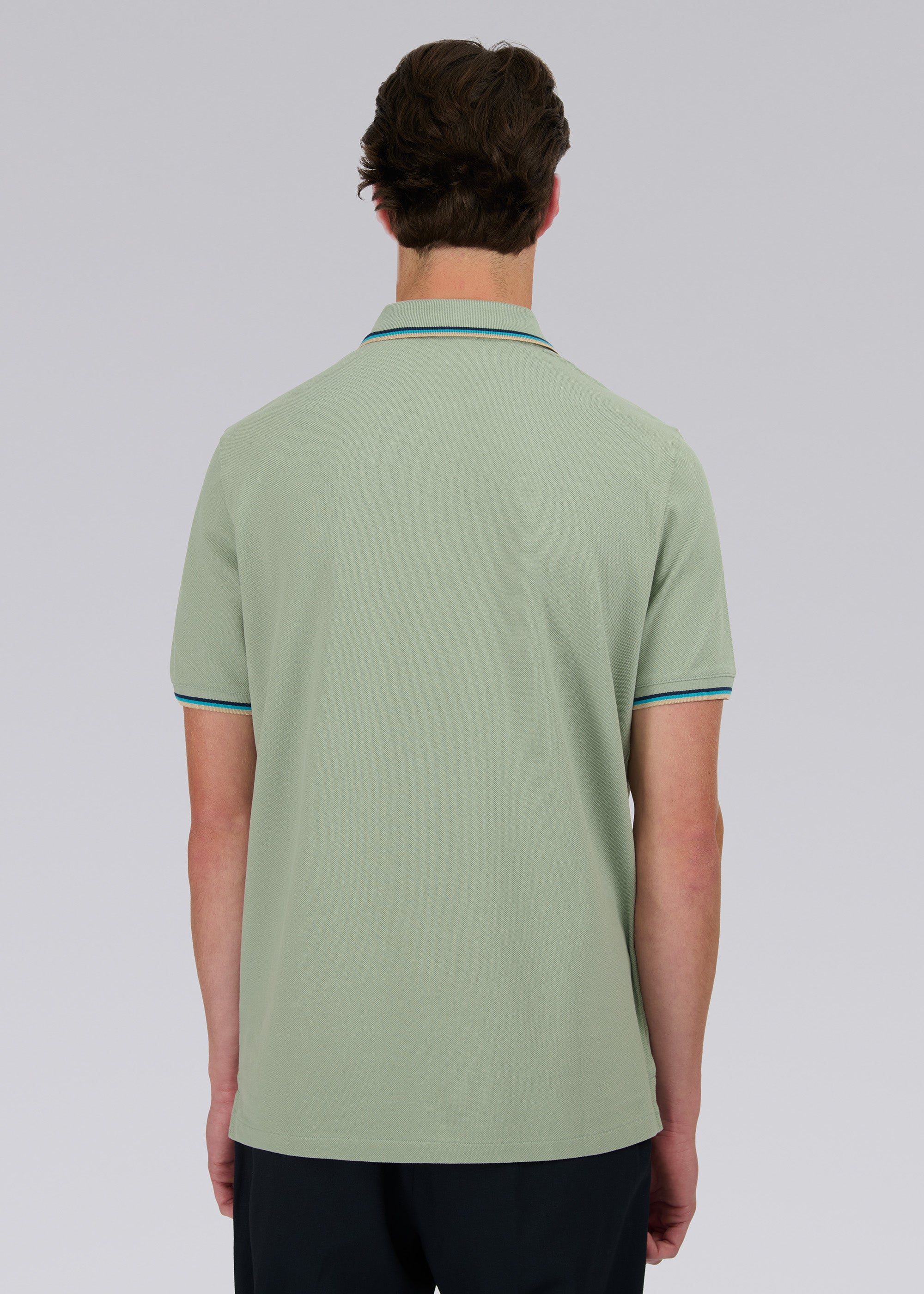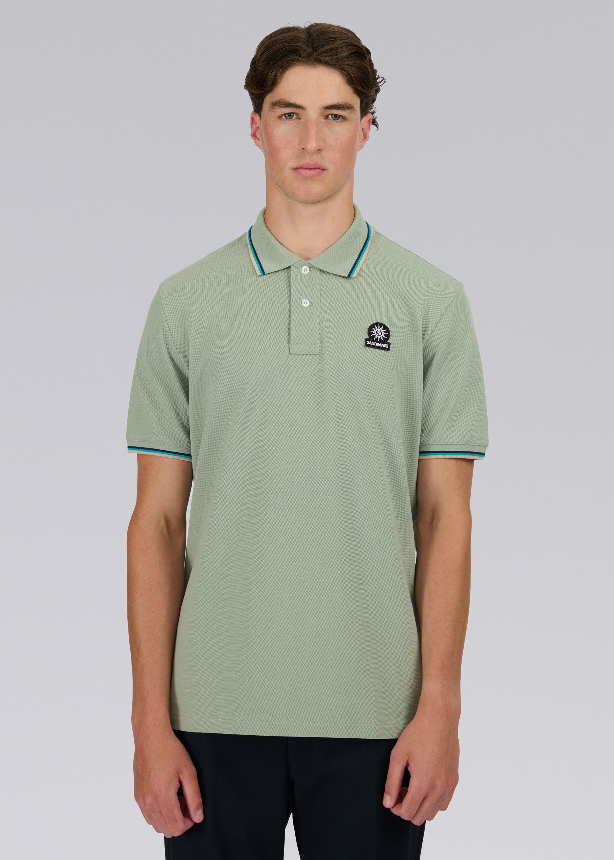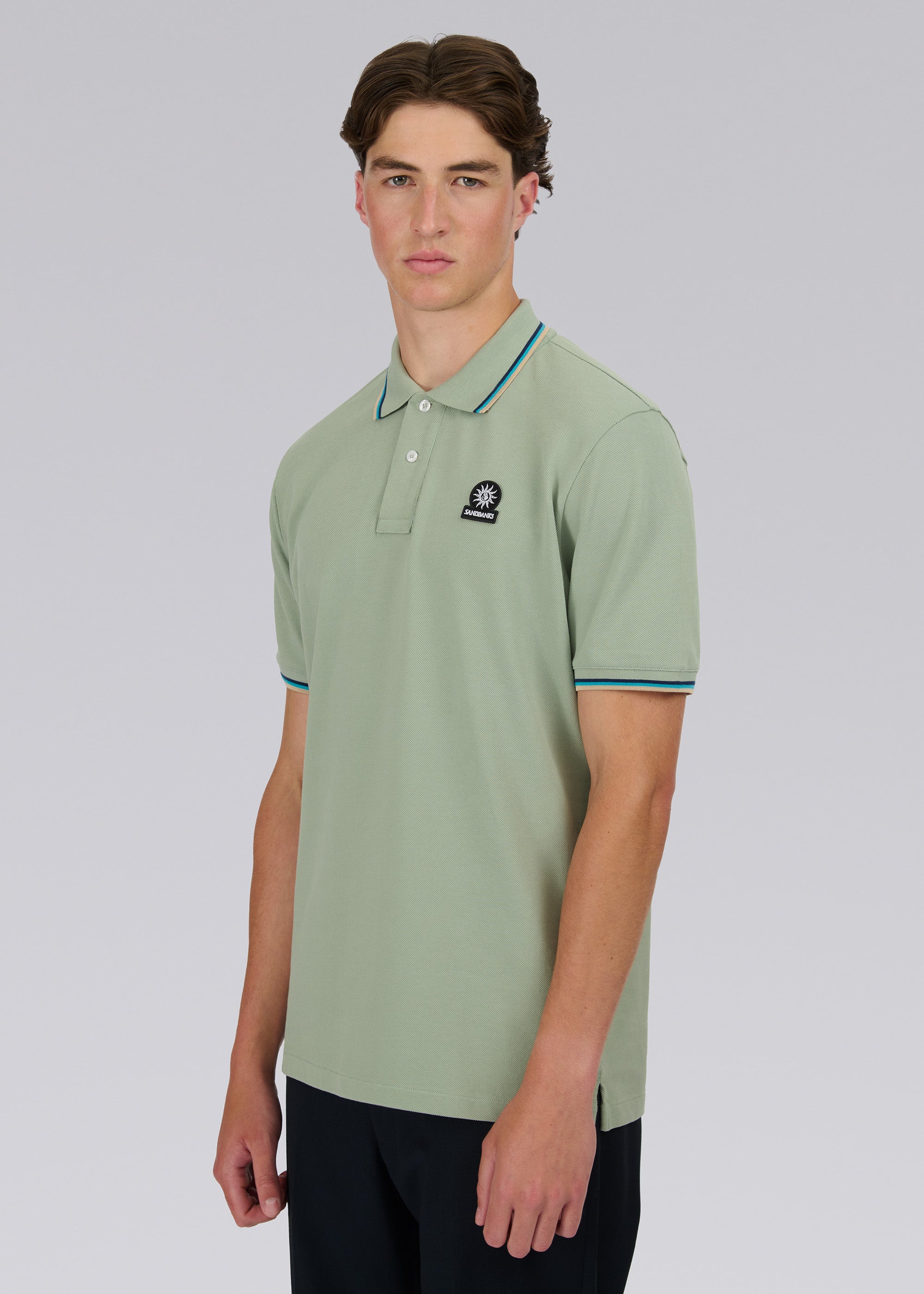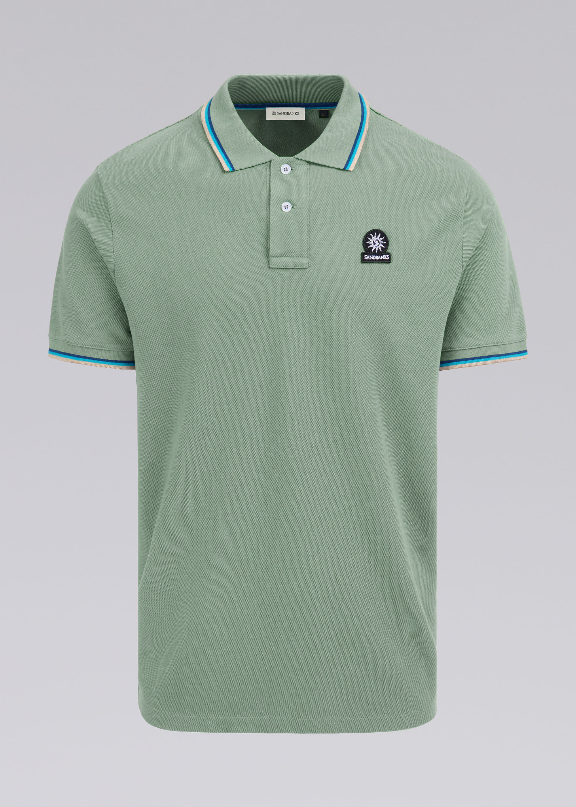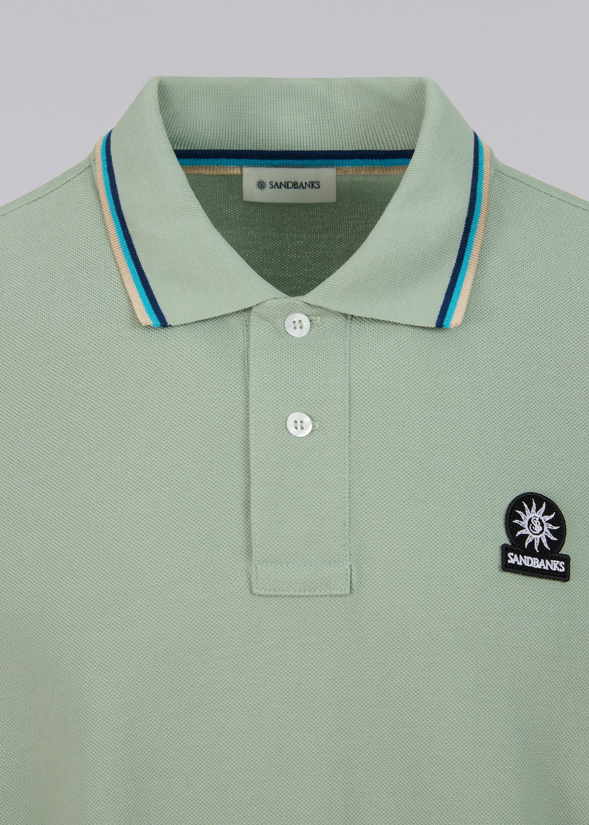 Sandbanks men's badge logo polo shirt in sage, made from 100% organic cotton. This classic fitting 2 button polo shirt features an embroidered badge logo on the chest, tri-colour tipped ribbed collar, cuff and back neck binding.