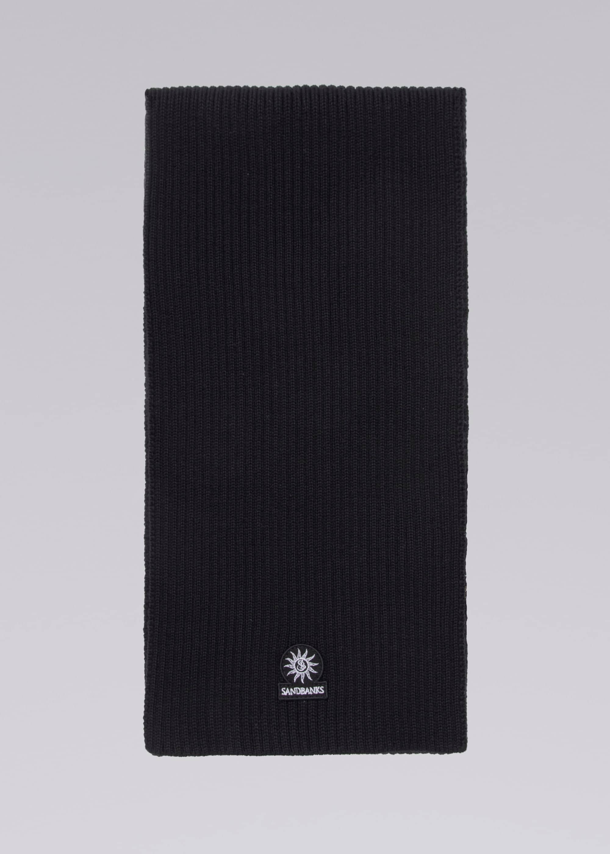 Sandbanks knitted badge logo scarf in black, made from merino wool mix.