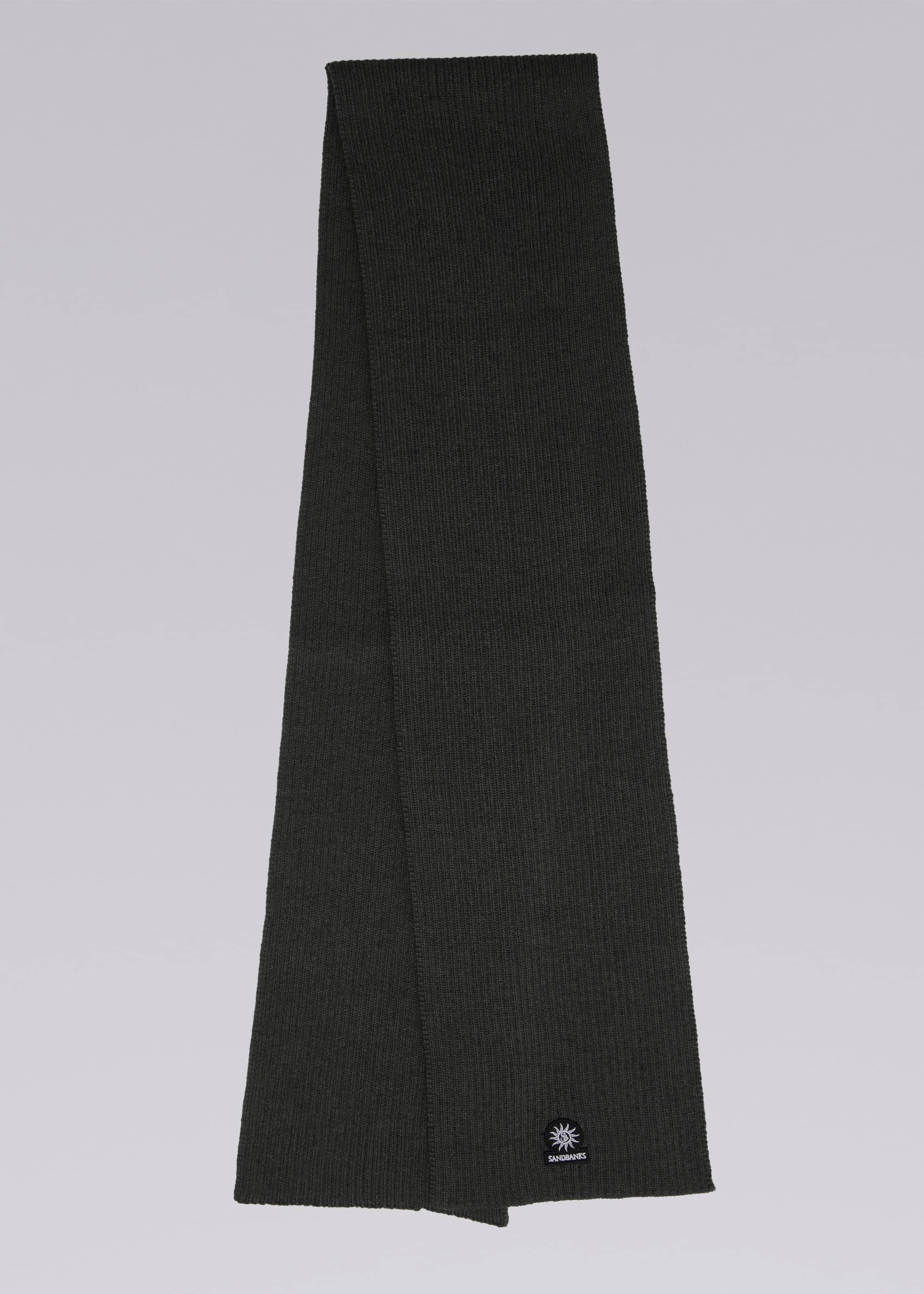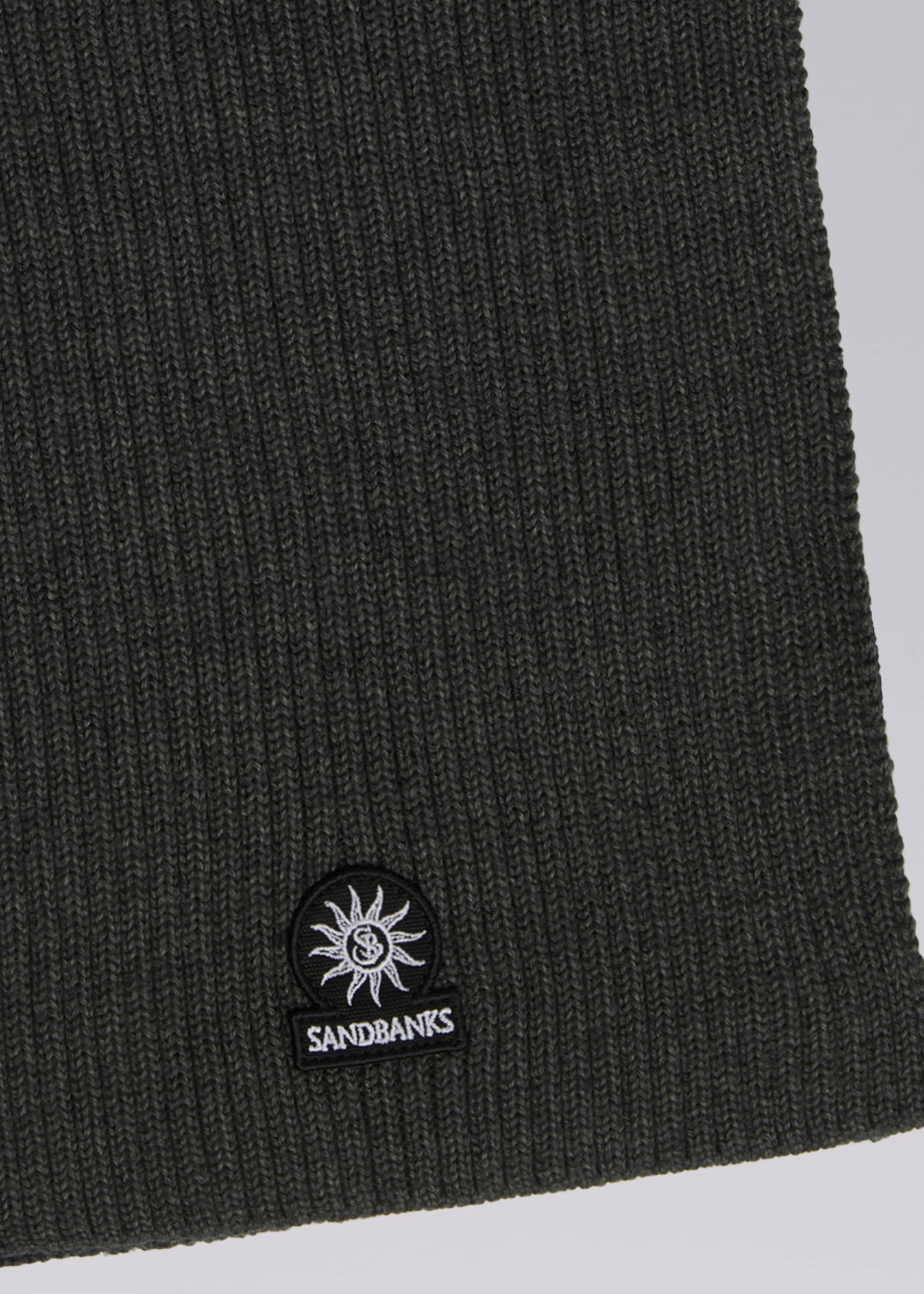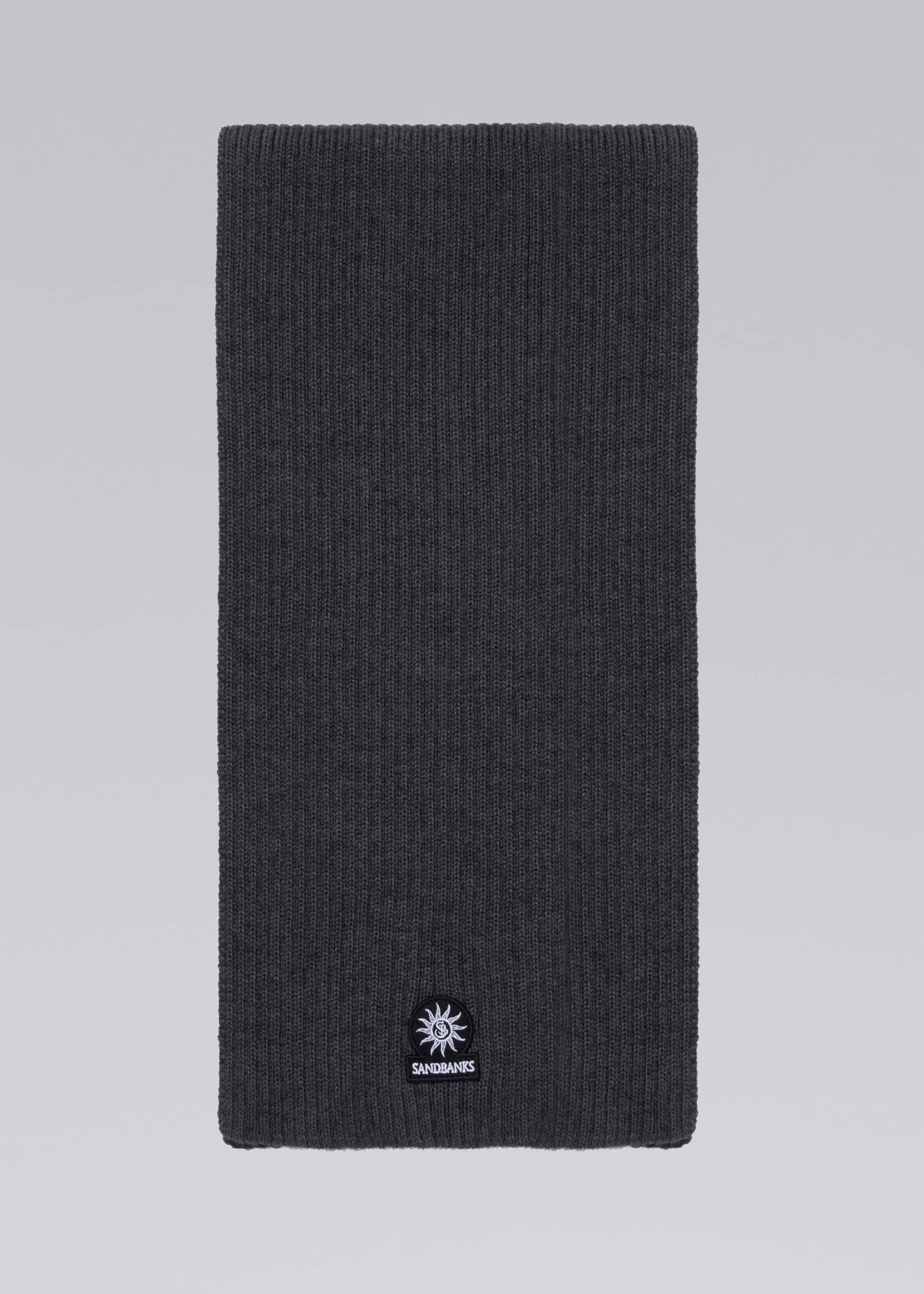 Sandbanks knitted badge logo scarf in charcoal, made from merino wool mix.