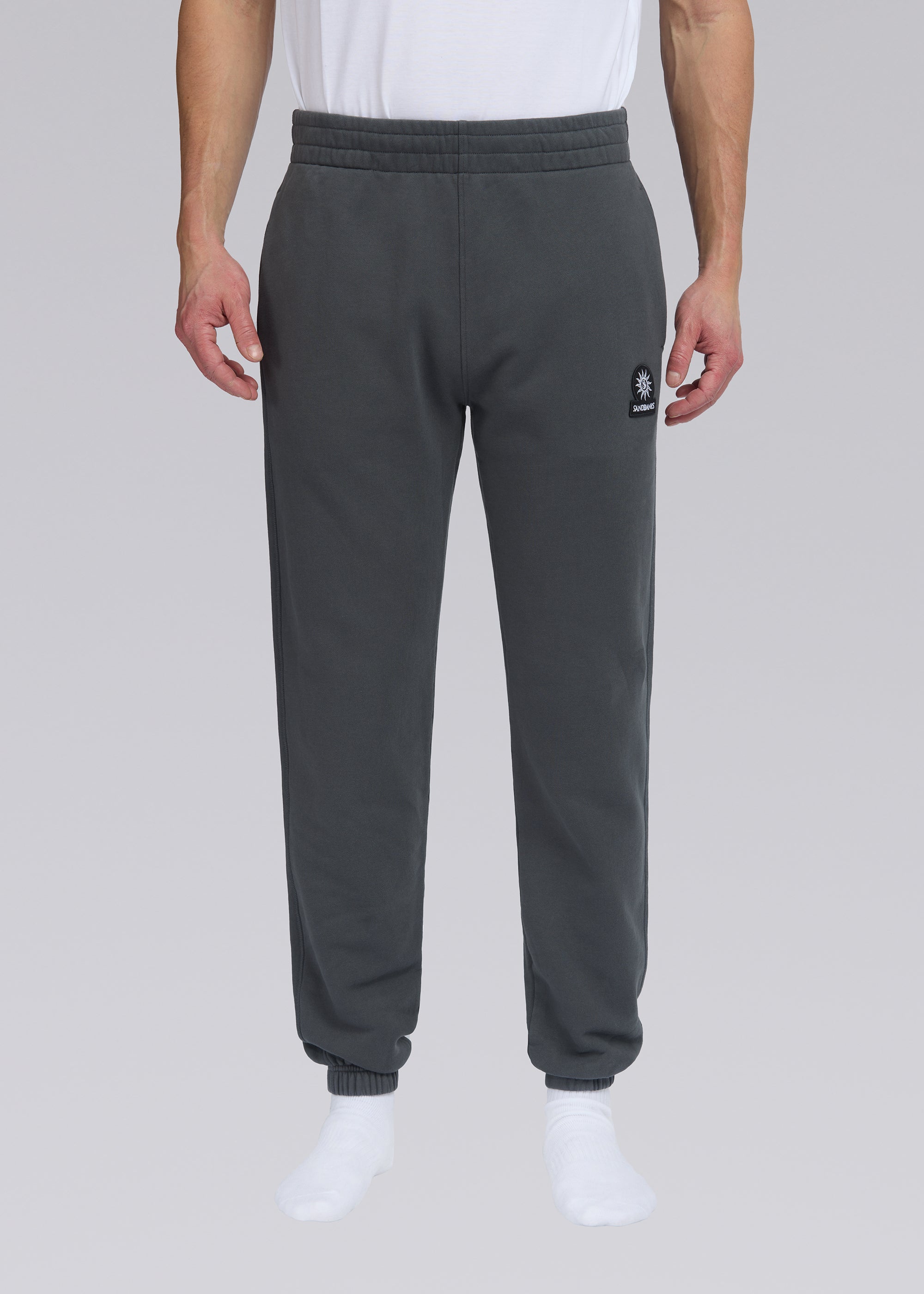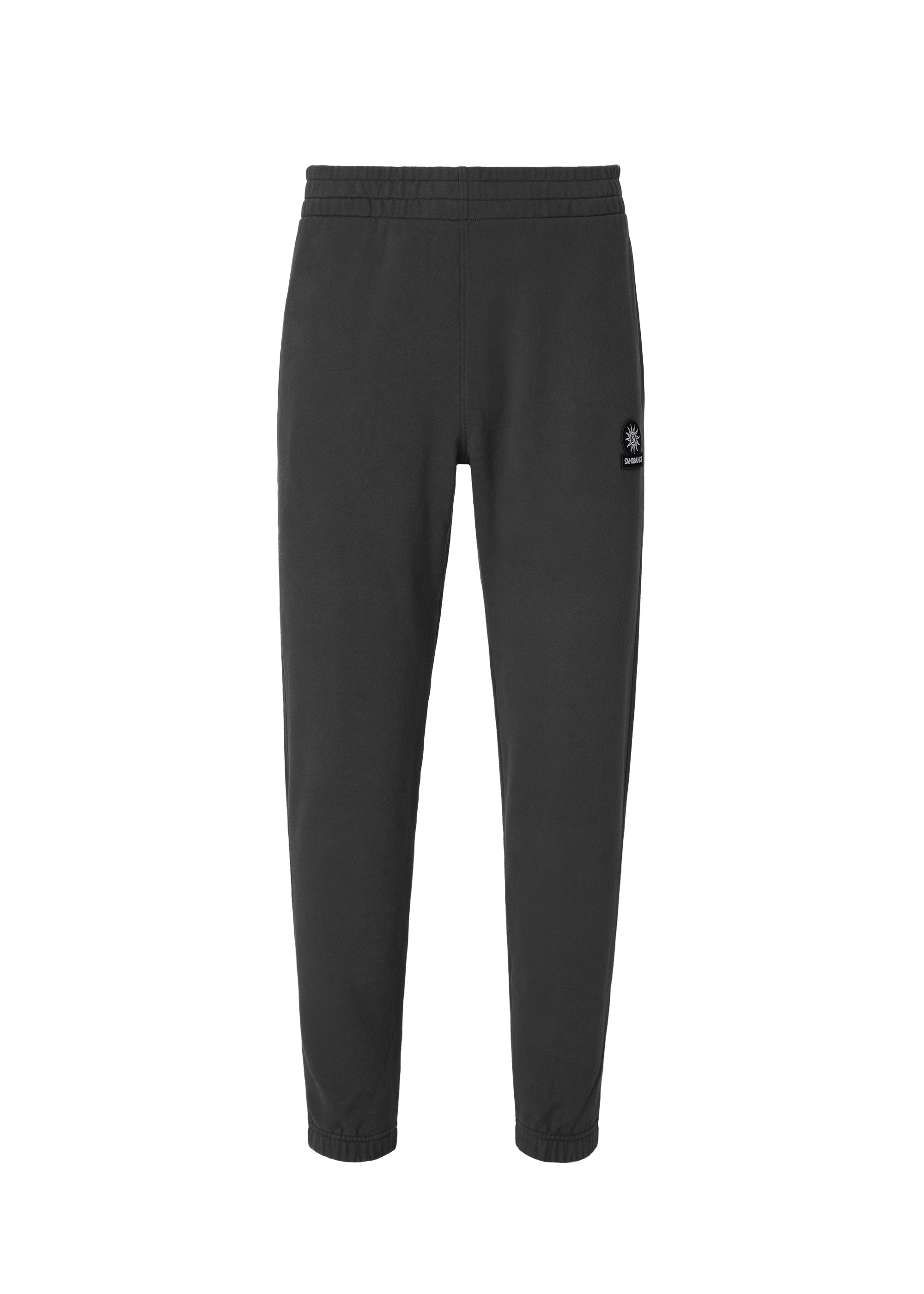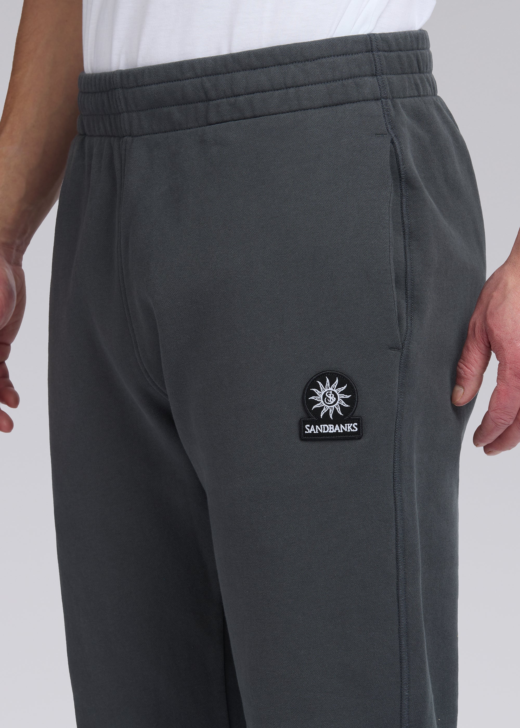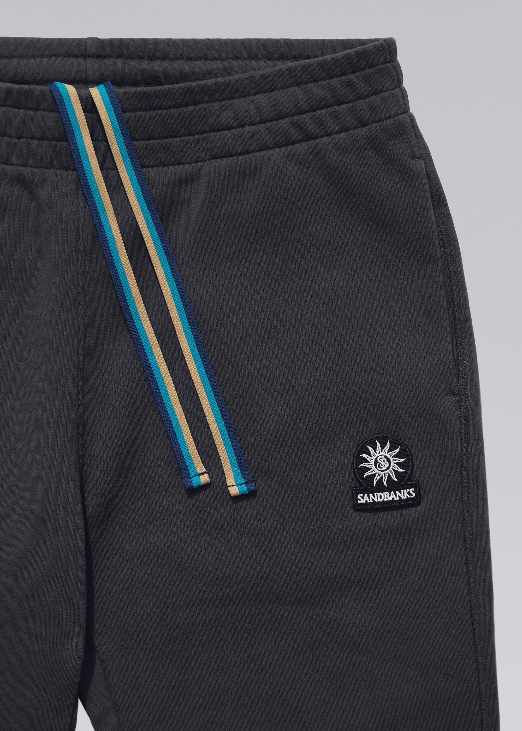 Our men's Sandbanks badge logo track pants in anthracite is constructed with a 400gsm diagonal knitted fabric that features a slight brushed back for a superior soft feeling and warmth, whilst remaining breathable. Made from 100% BCI Cotton with a embroidered badge logo, and internal tri-colour flat draw cord.