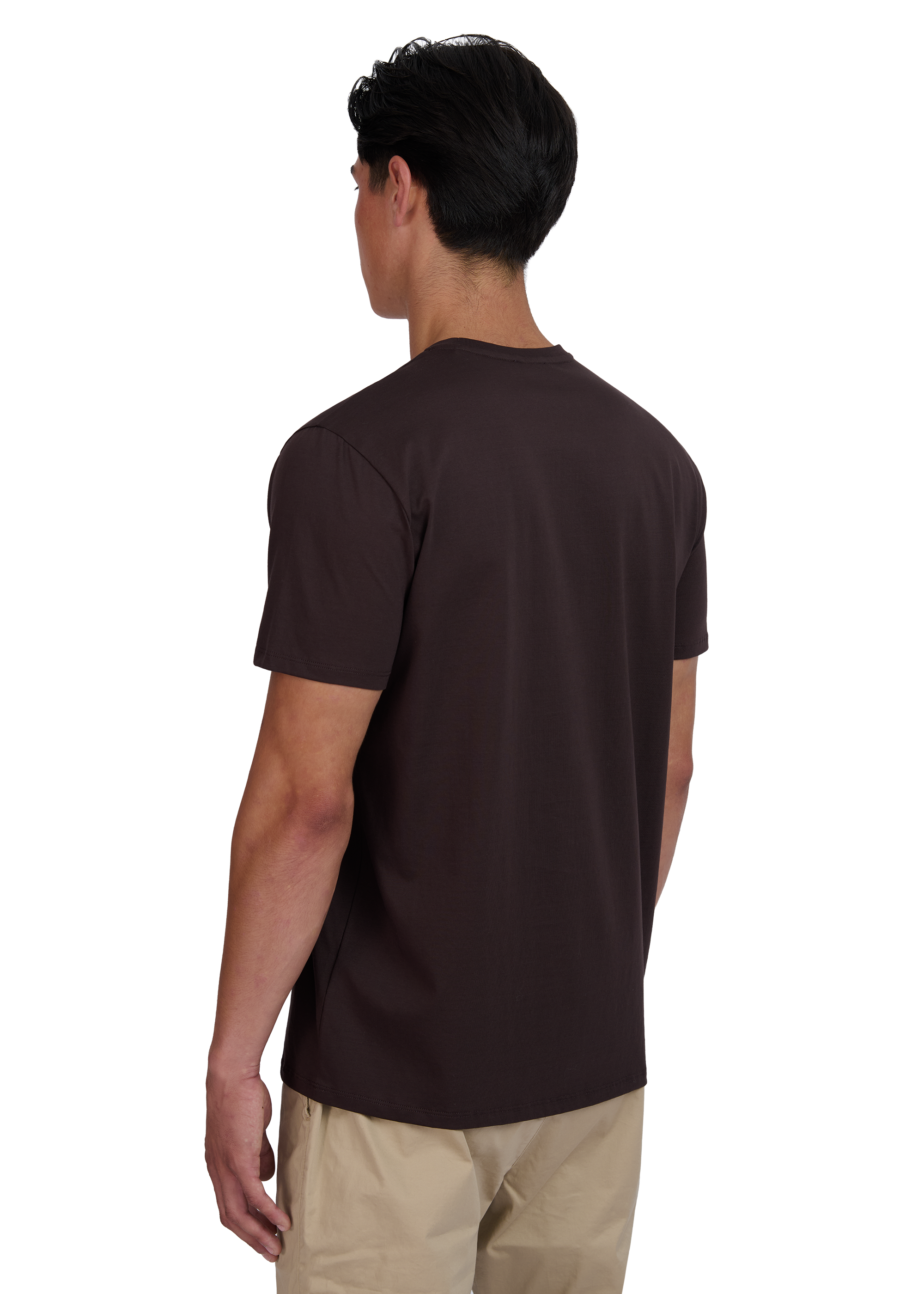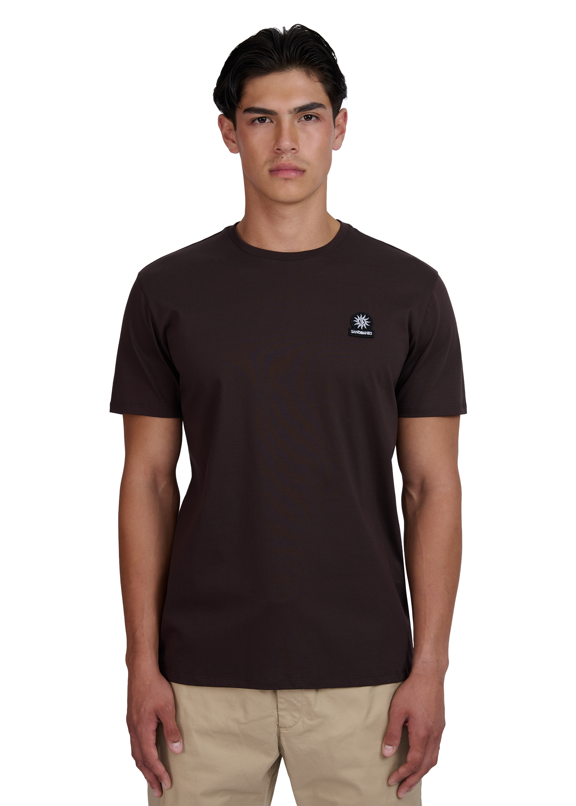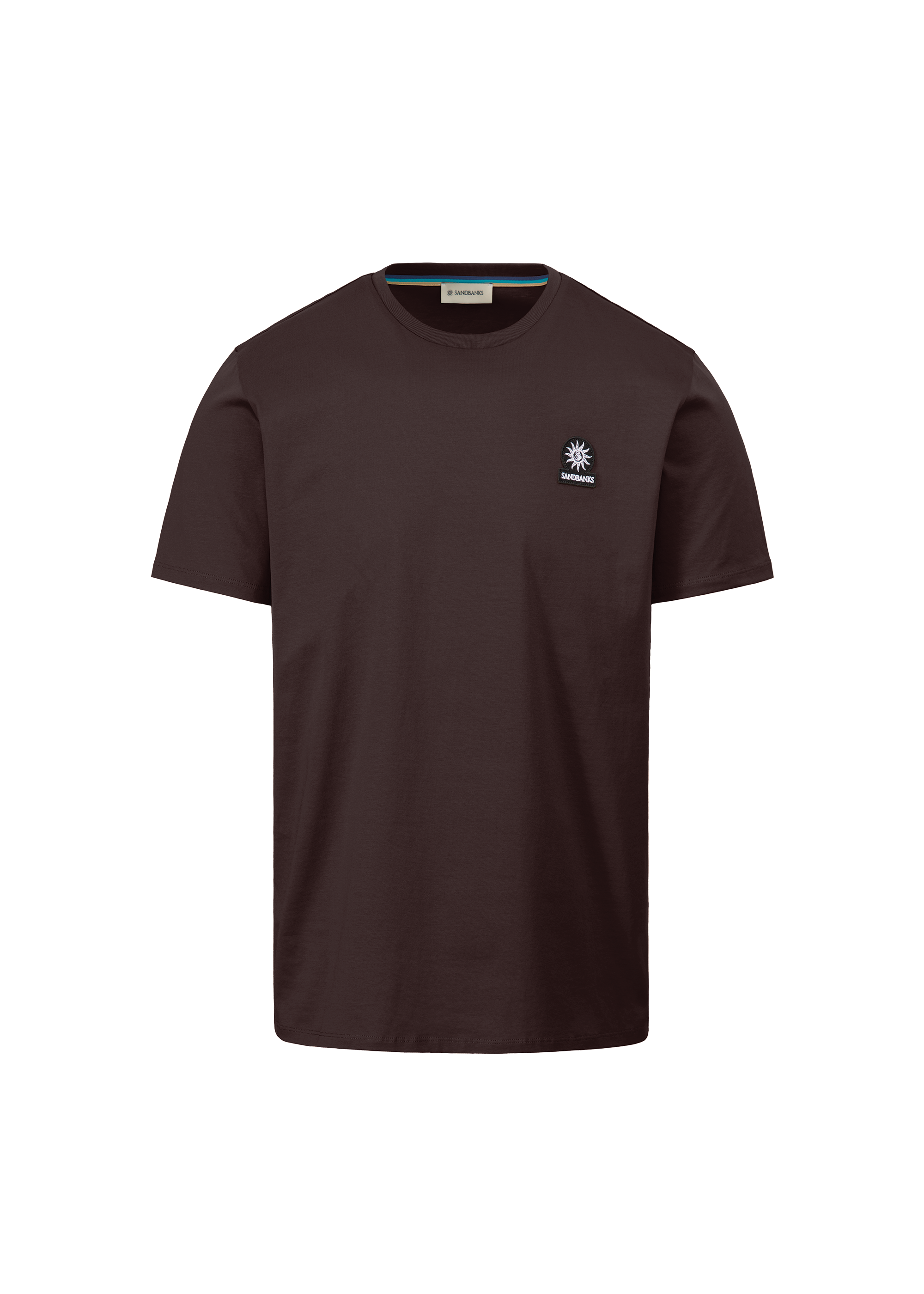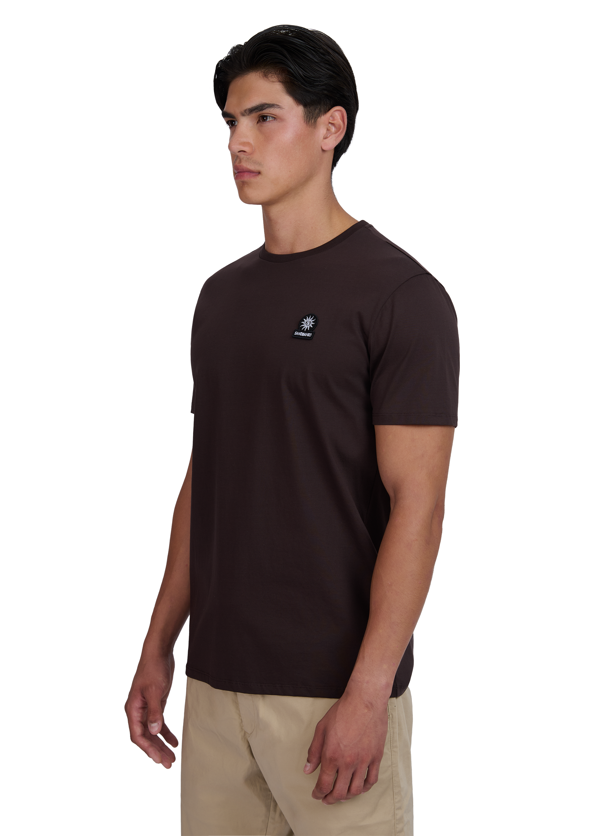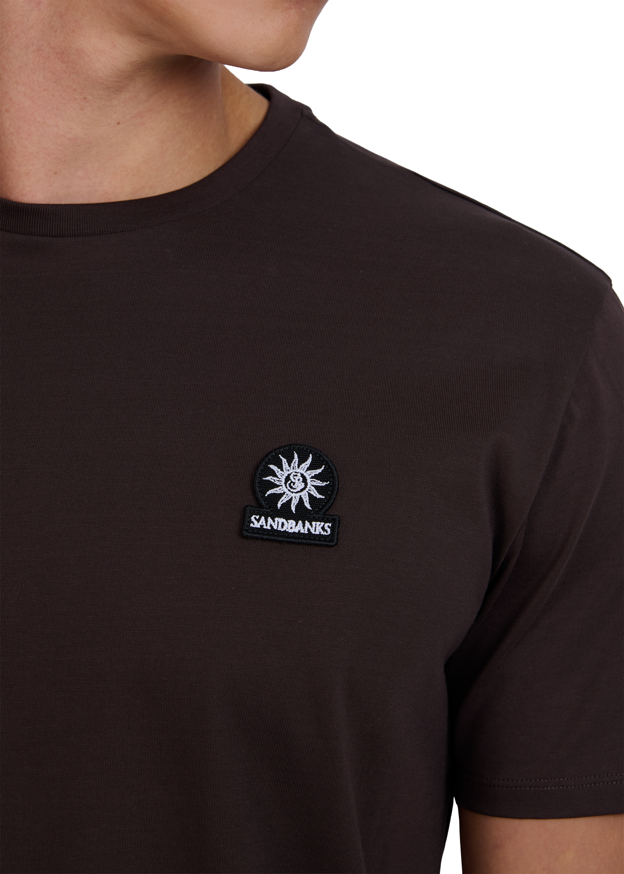 Sandbanks men's badge logo t-shirt in brown, made from mercerised cotton for a silky and luxurious feel. This classic fitting crew neck t-shirt features an embroidered badge logo on the chest and tri-colour back neck binding.