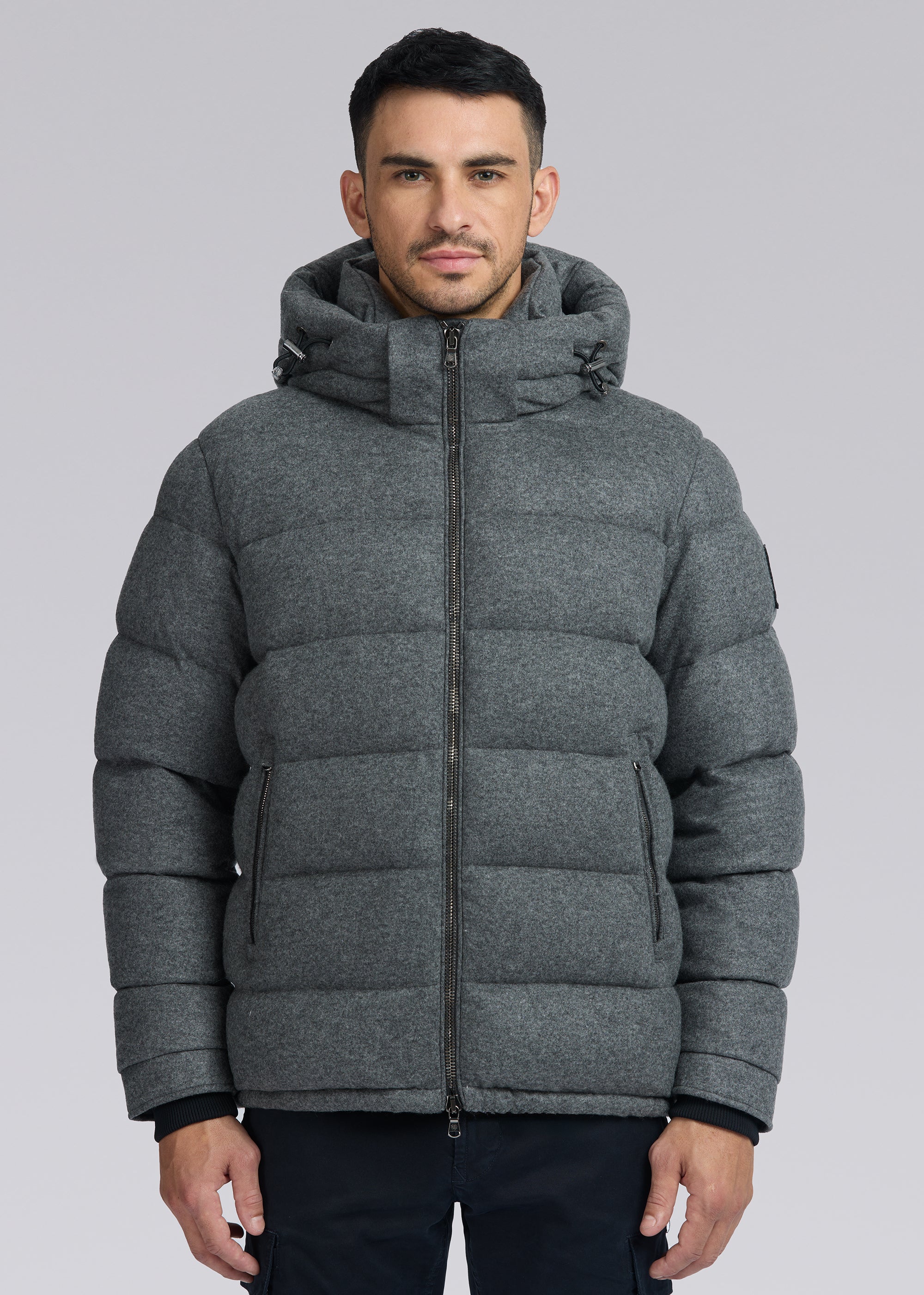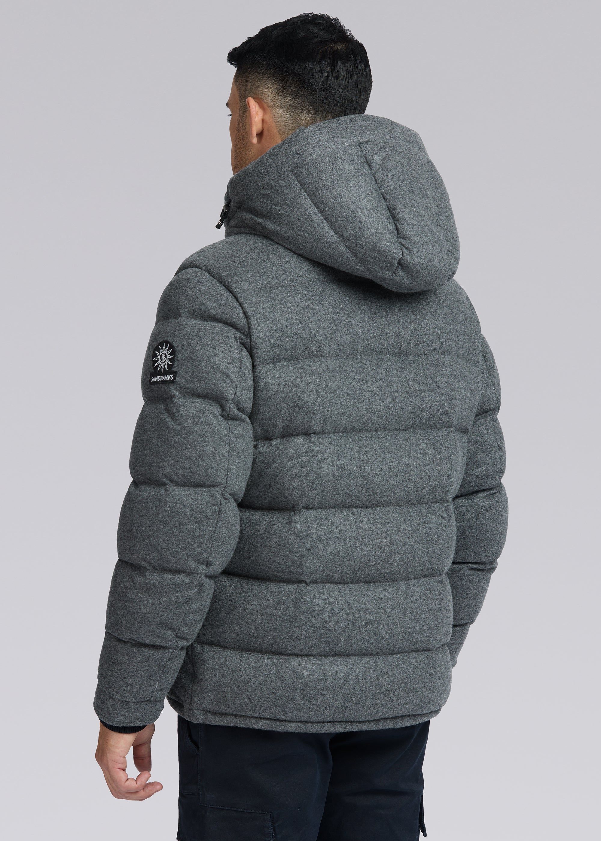 Our signature Sandbanks Banks puffer jacket transformed into statement outerwear as part of our Artisan Series. This luxury jacket is crafted from Italian artistry cashmere, meticulously finished with gun metal components and Lampo zips, this puffer has high thermal retention and features a Sandbanks embroidered logo badge, detachable hood and filled with recycled natural down.