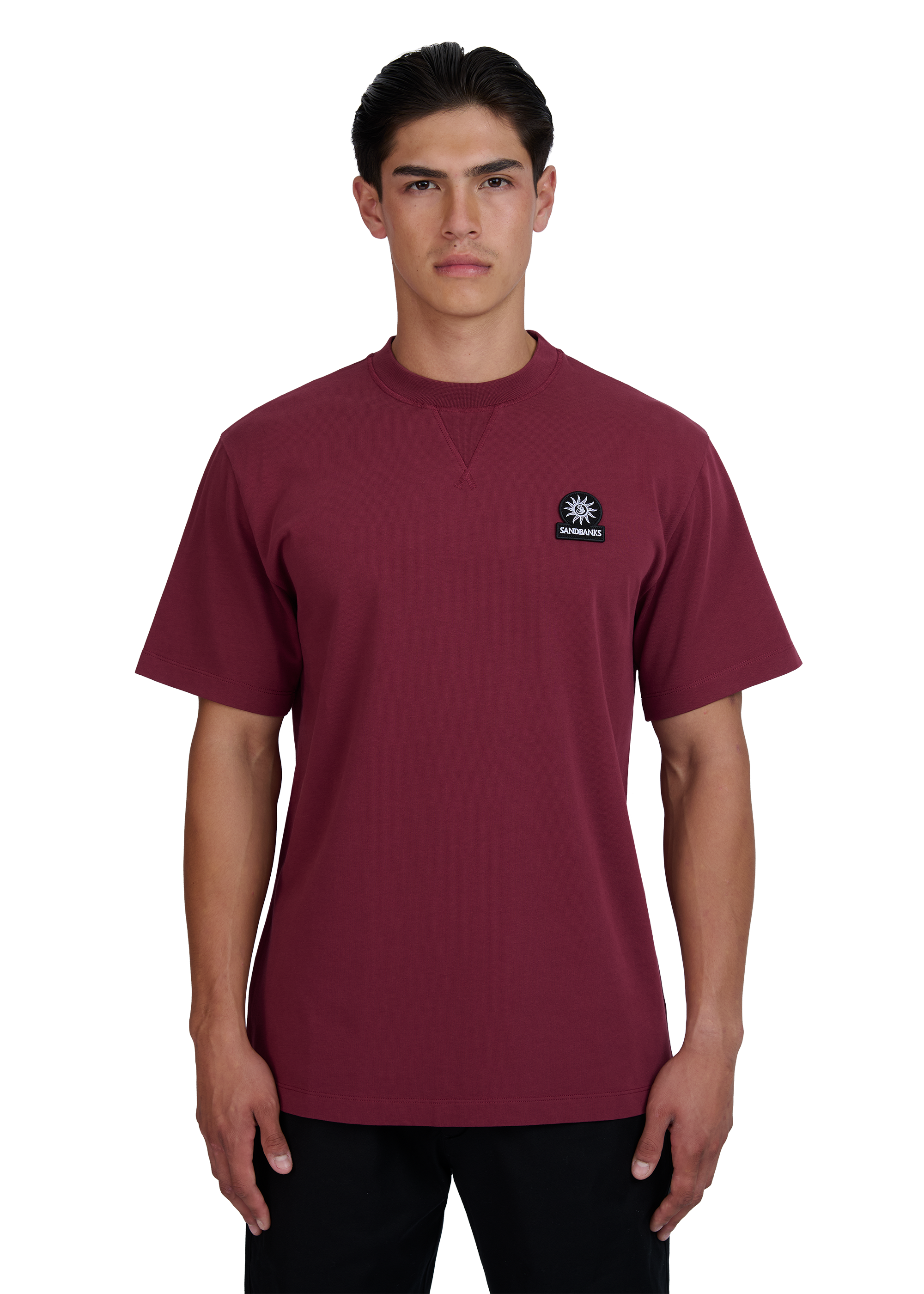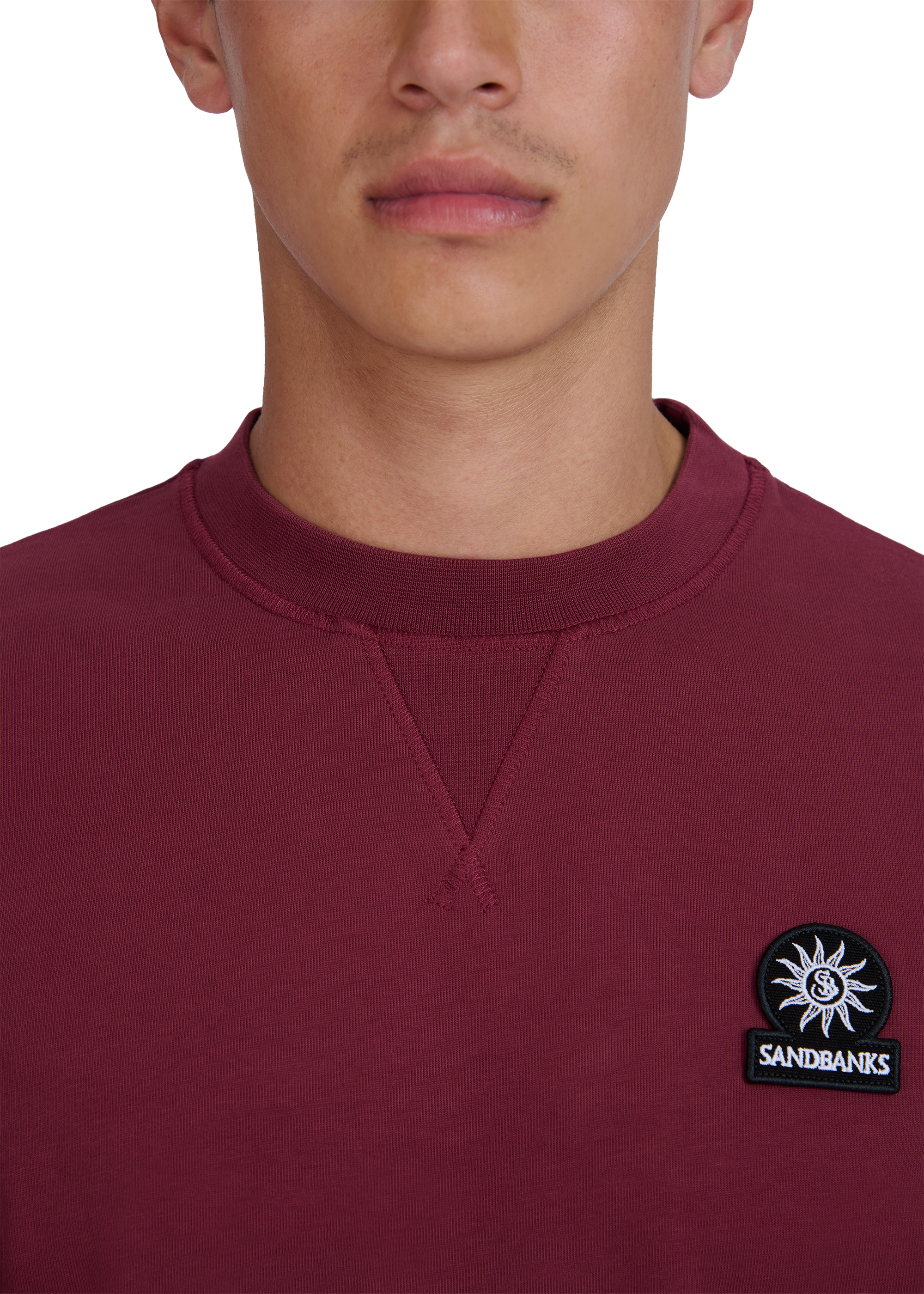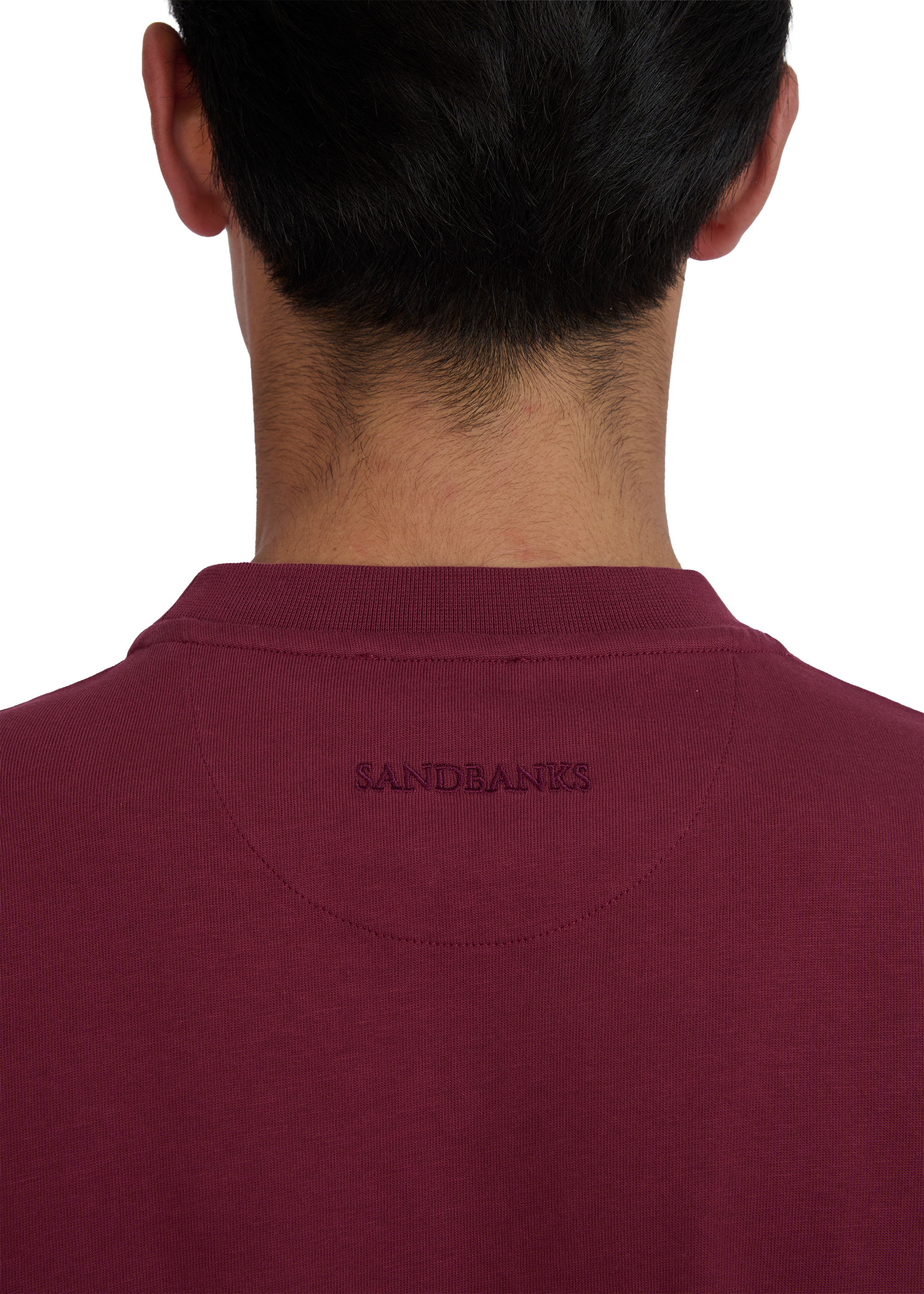 Sandbanks men's double jersey collegiate t-shirt in port, made from mercerised cotton for a silky and luxurious feel. This relaxed fit crew neck t-shirt features an embroidered badge logo on the chest and tri-colour back neck binding.
