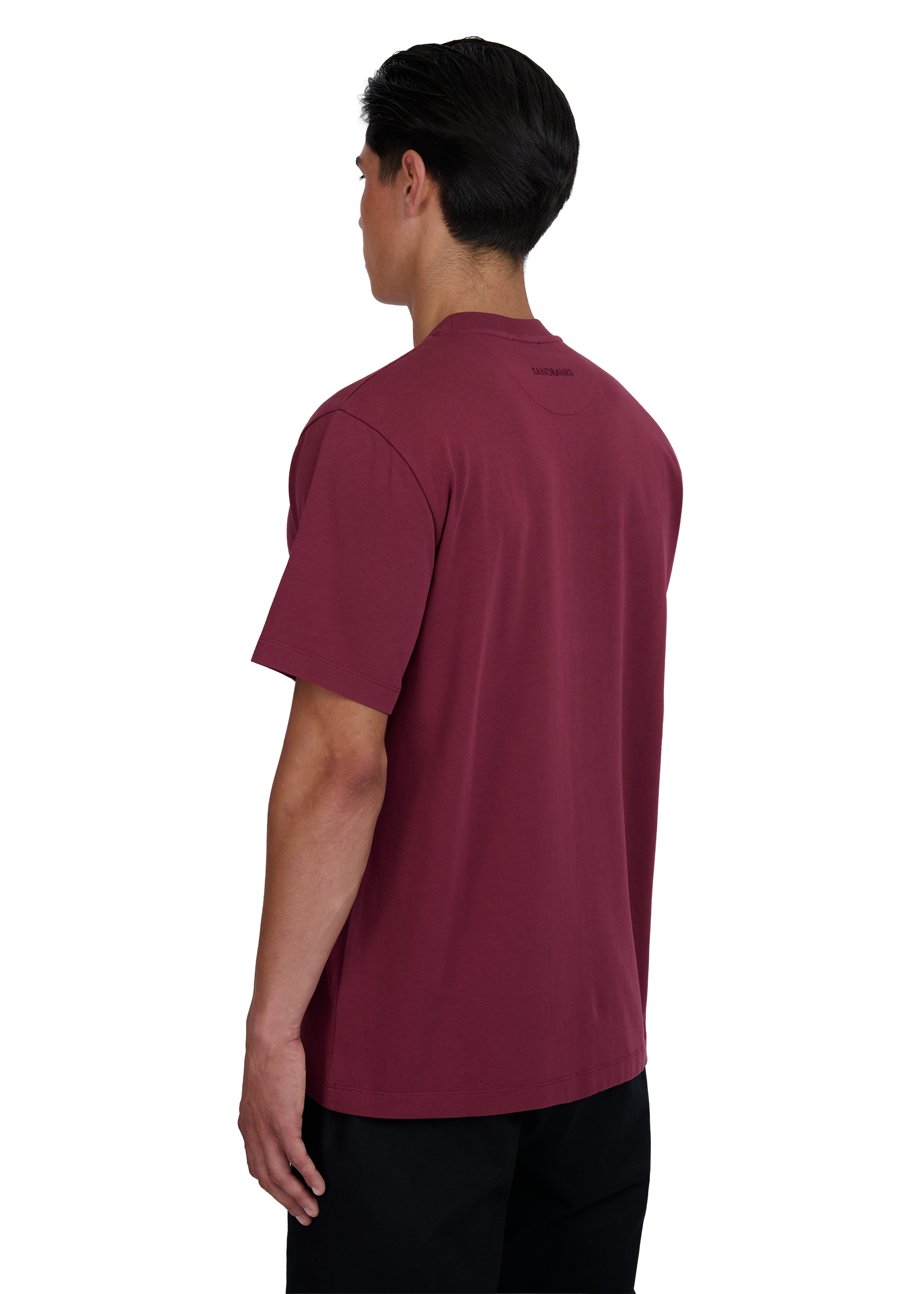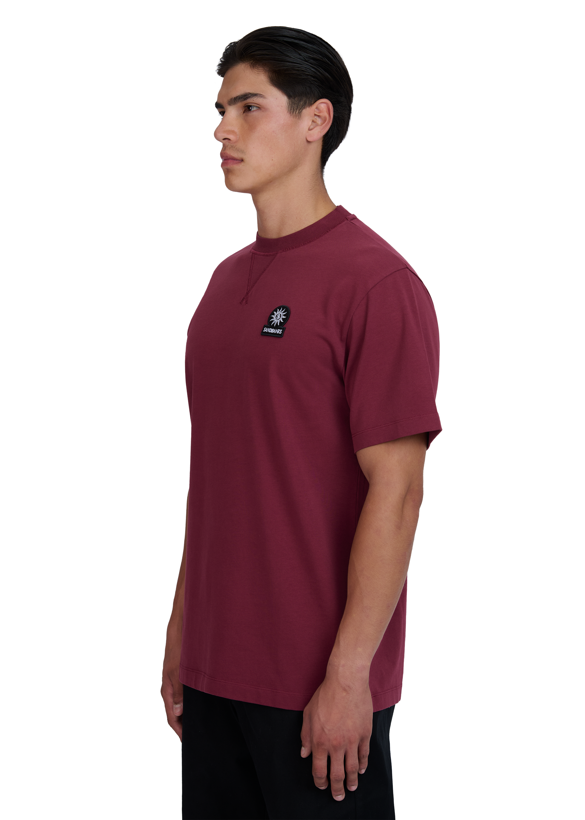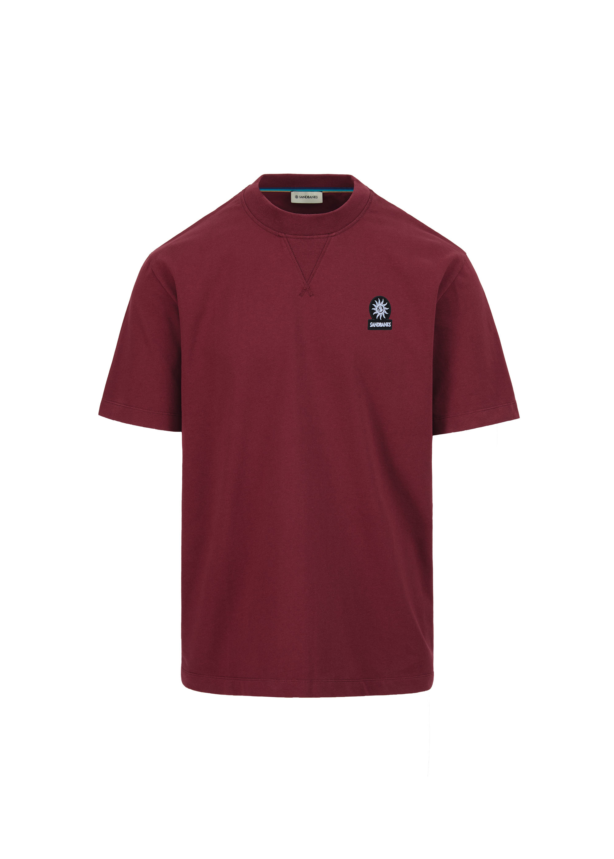 Sandbanks men's double jersey collegiate t-shirt in port, made from mercerised cotton for a silky and luxurious feel. This relaxed fit crew neck t-shirt features an embroidered badge logo on the chest and tri-colour back neck binding.