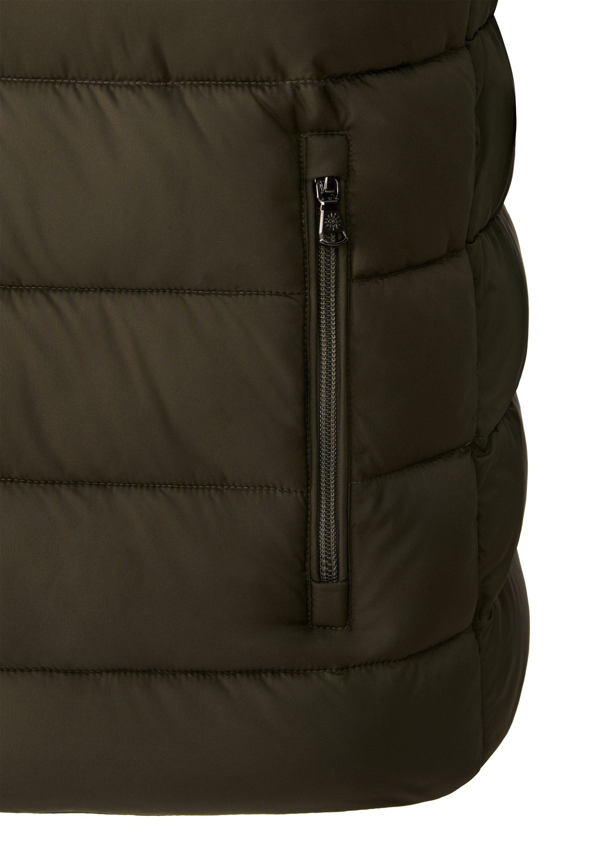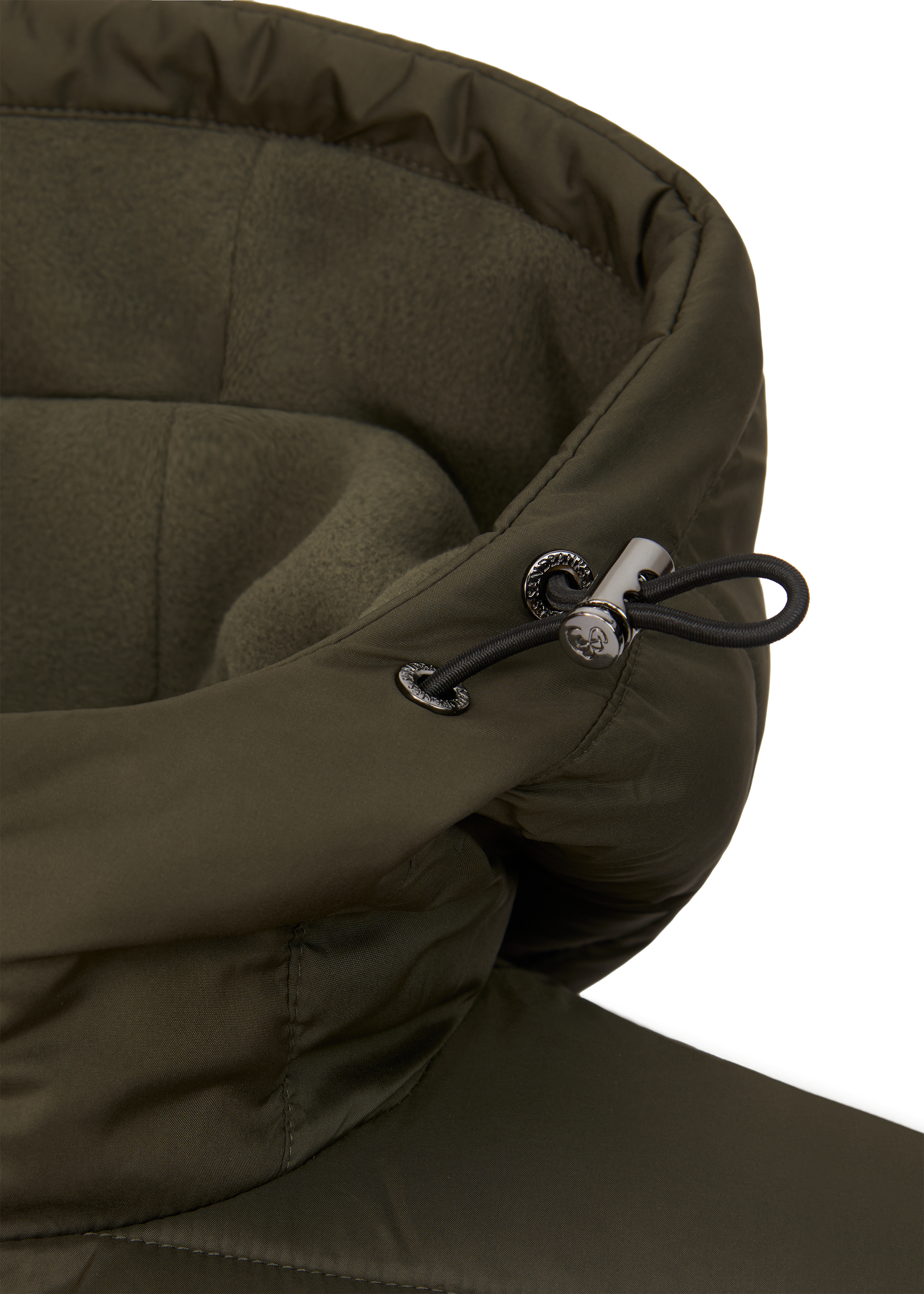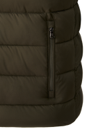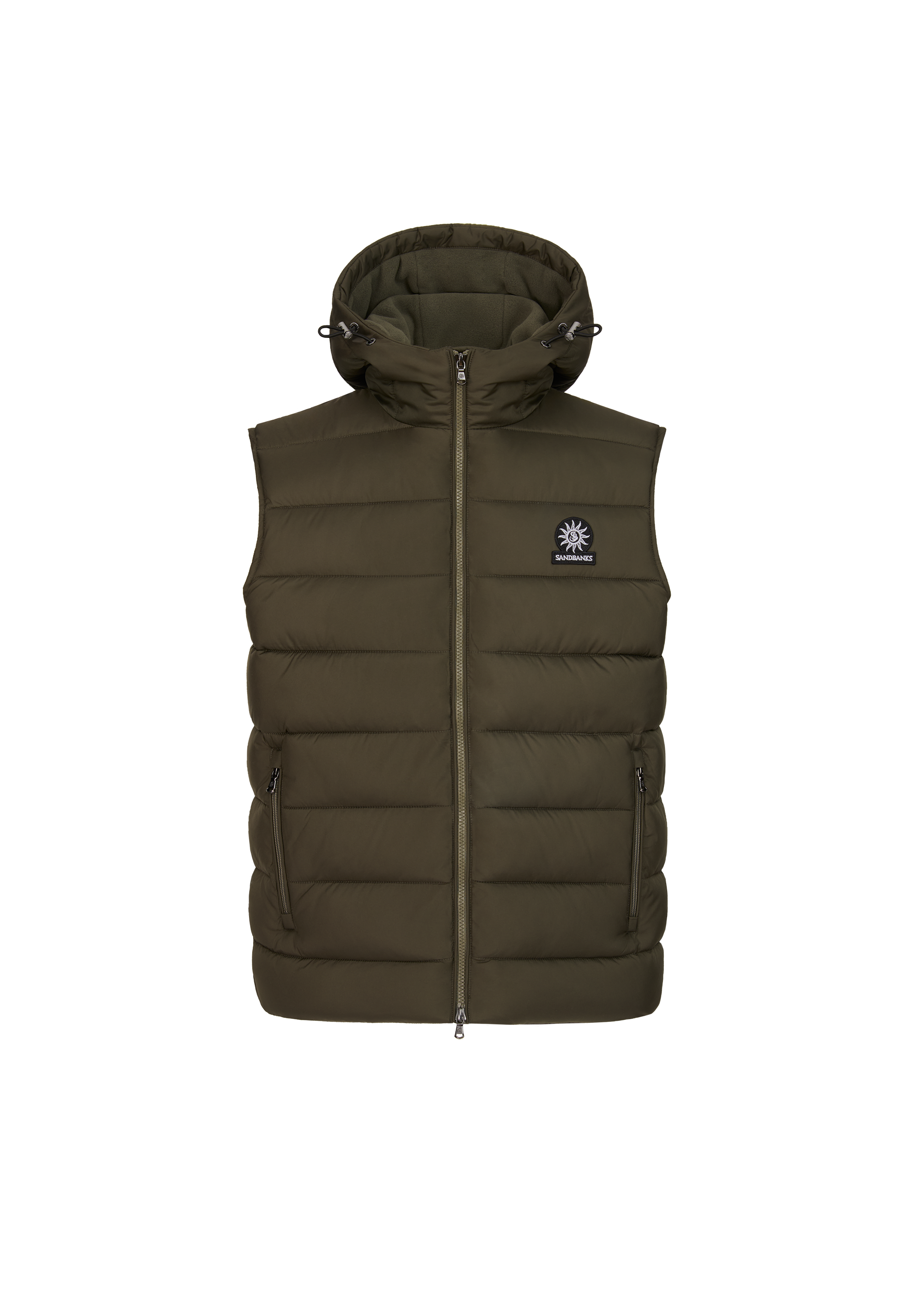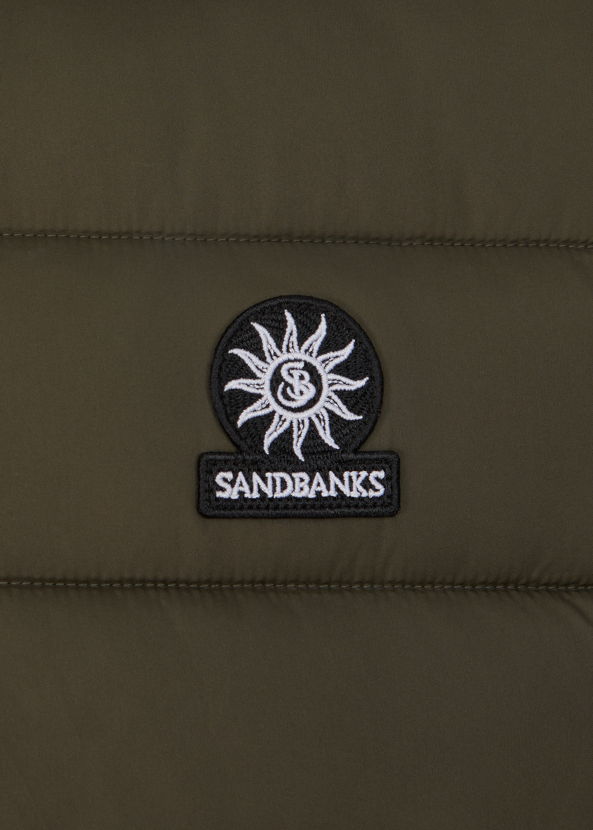 Sandbanks Frontier Hooded Puffer Gilet in khaki. This lightweight gilet is made almost entirely from recycled plastic bottles and features a Sandbanks ottoman embroidered chest badge, a 2-way YKK Vislon central zip, YKK coil side entry pockets with fleece lining, and a micro polar fleece lined hood with cord adjusters.