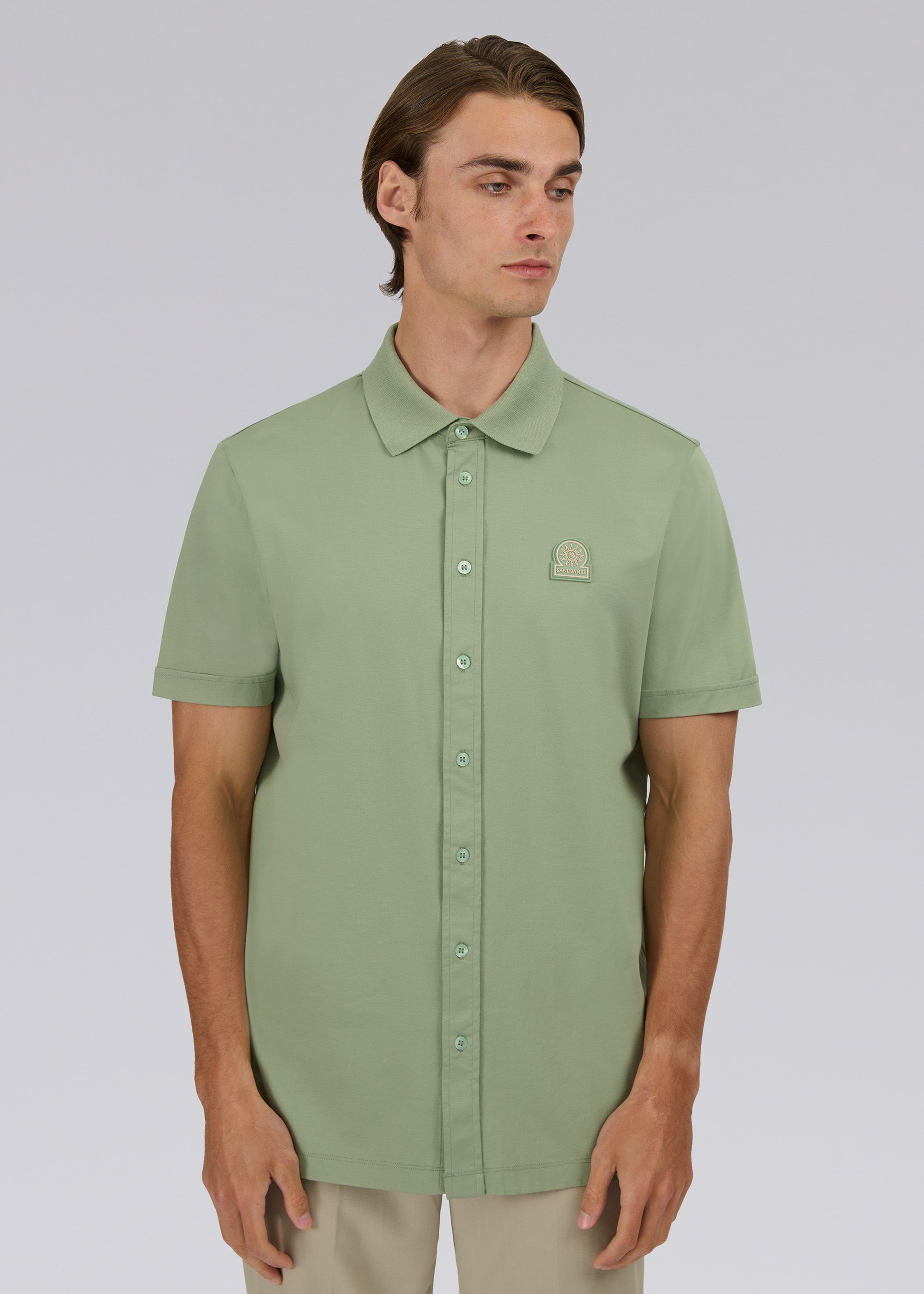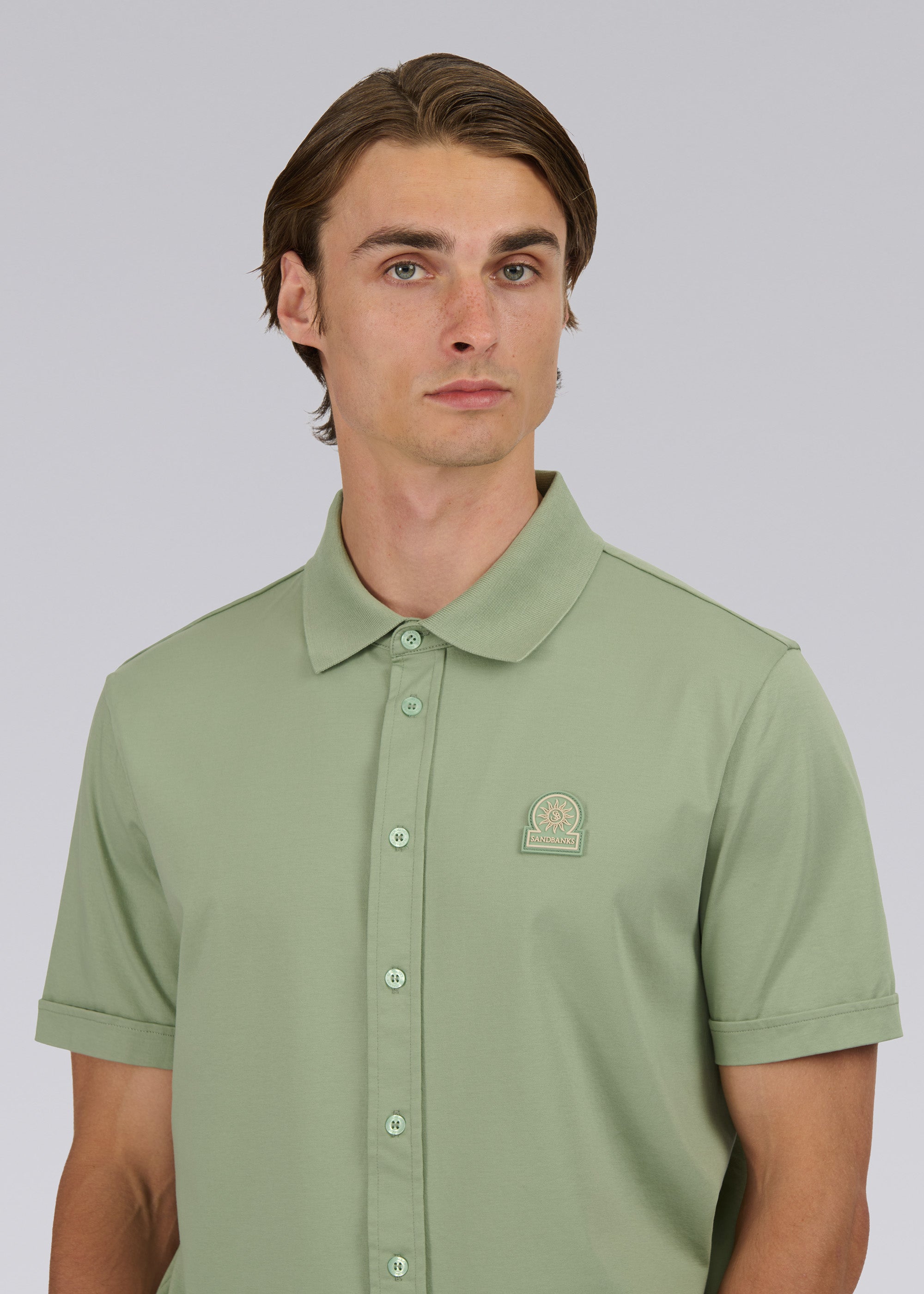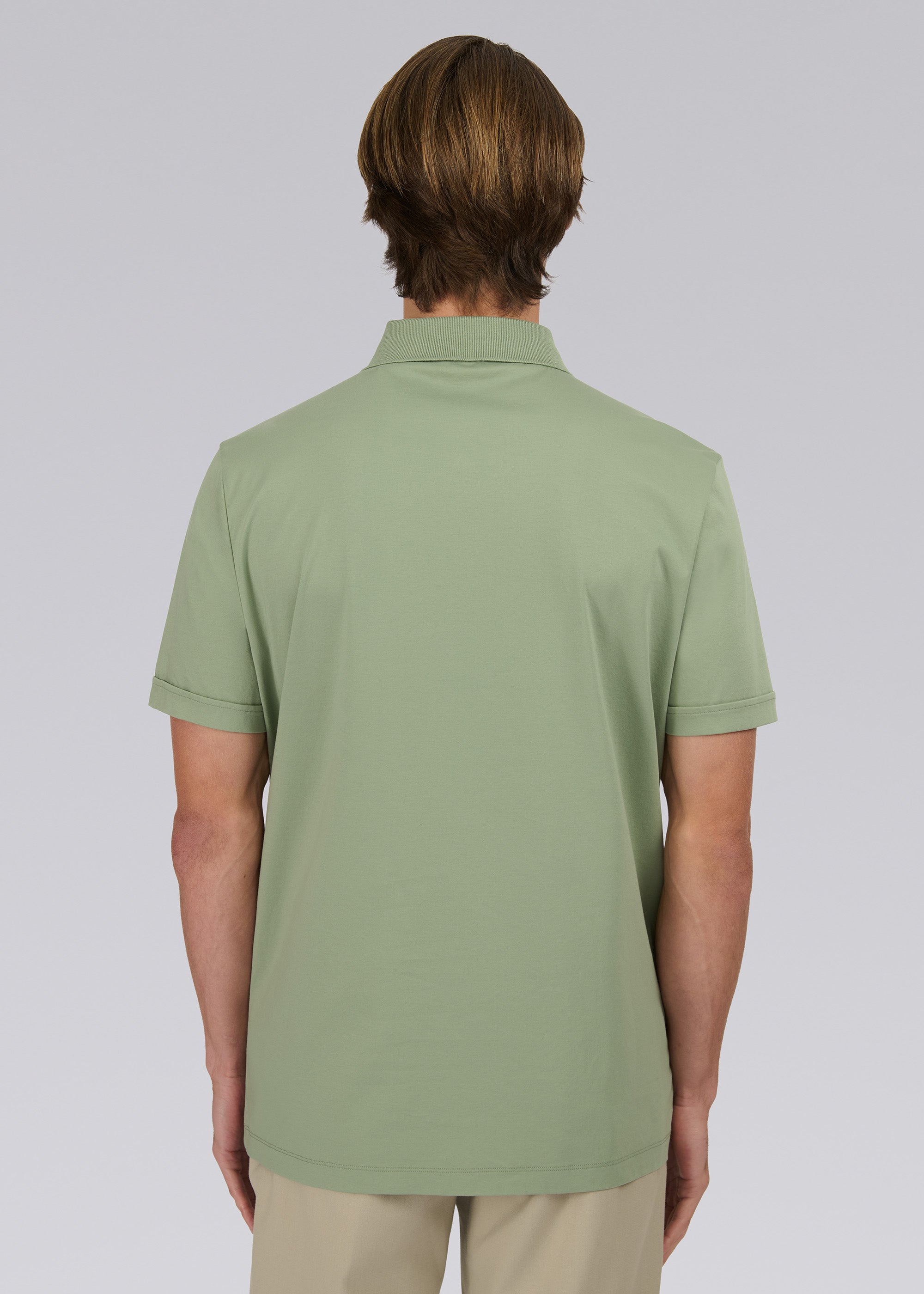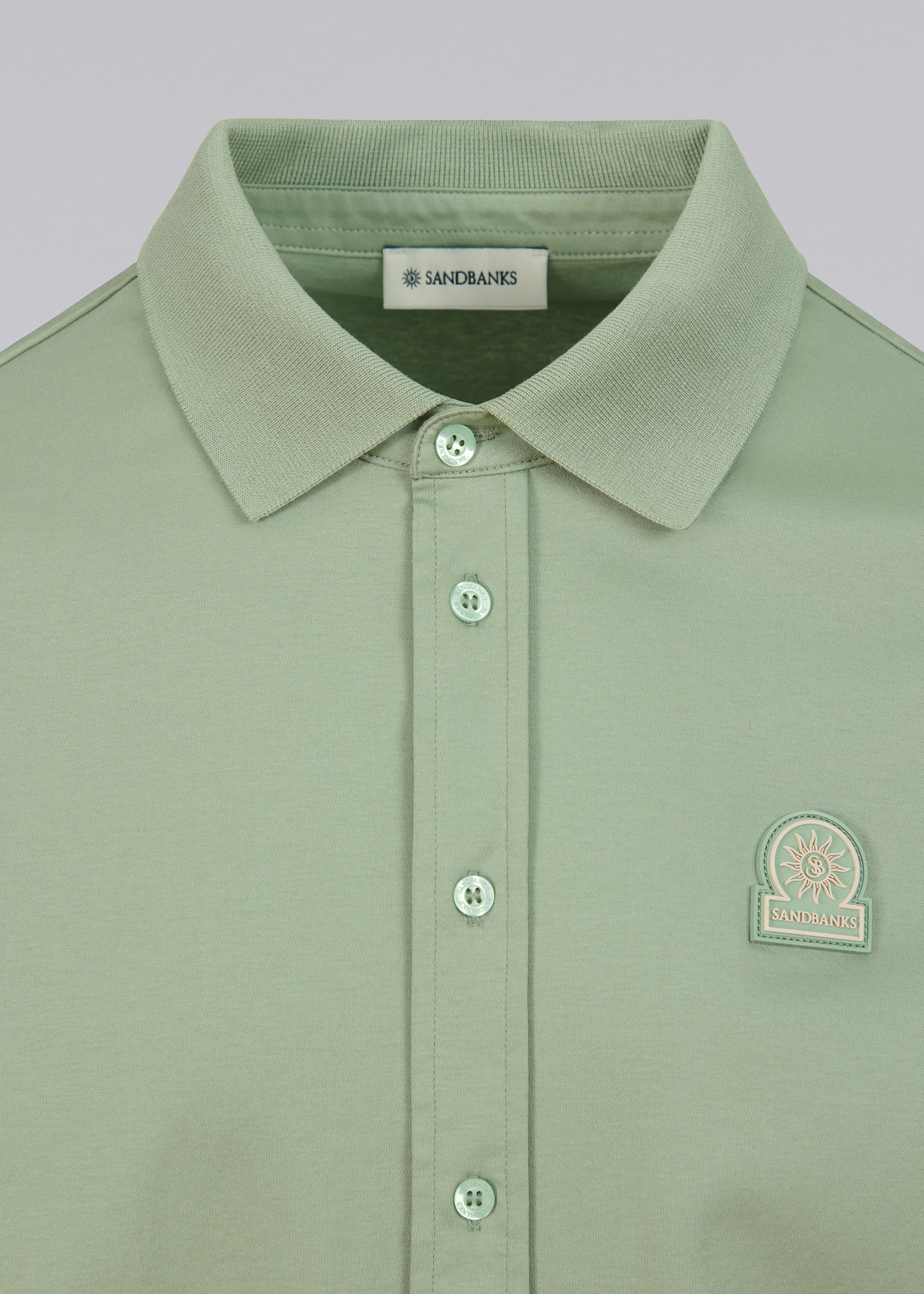 Sandbanks men's full button Interlock polo shirt in sage, made from 100% mercerised interlock bci cotton for a soft and luxurious handle. This polo shirt features a rubber Sandbanks badge logo on the chest, tri-colour neck binding and sage opaque Sandbanks branded buttons.