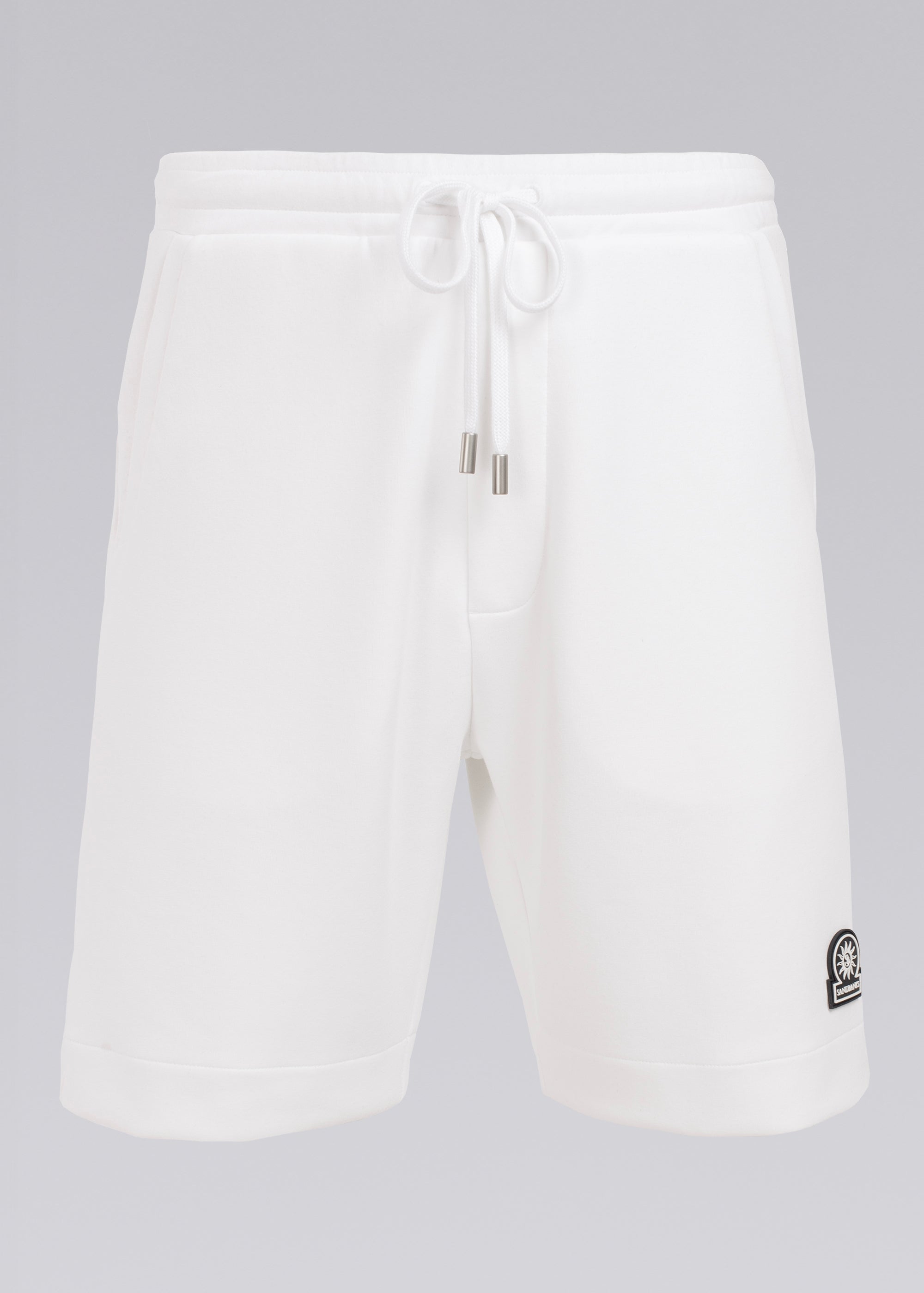 Sandbanks men's badge logo interlock shorts in white. This classic fitting garment is made from an interlock fabric for a superior smooth finish, featuring navy rubber badge with contrast white branding, and engraved gunmetal cord ends.