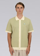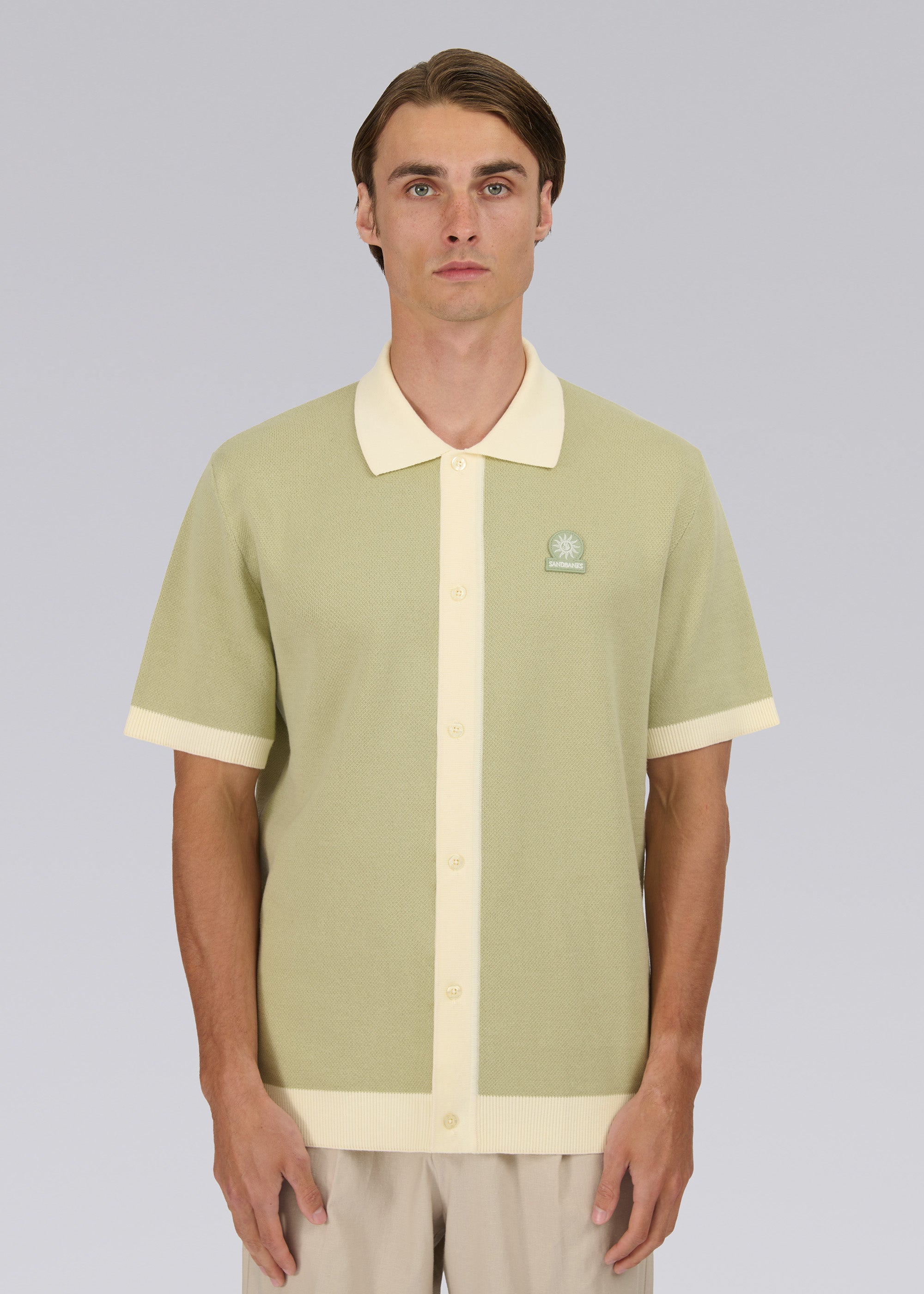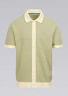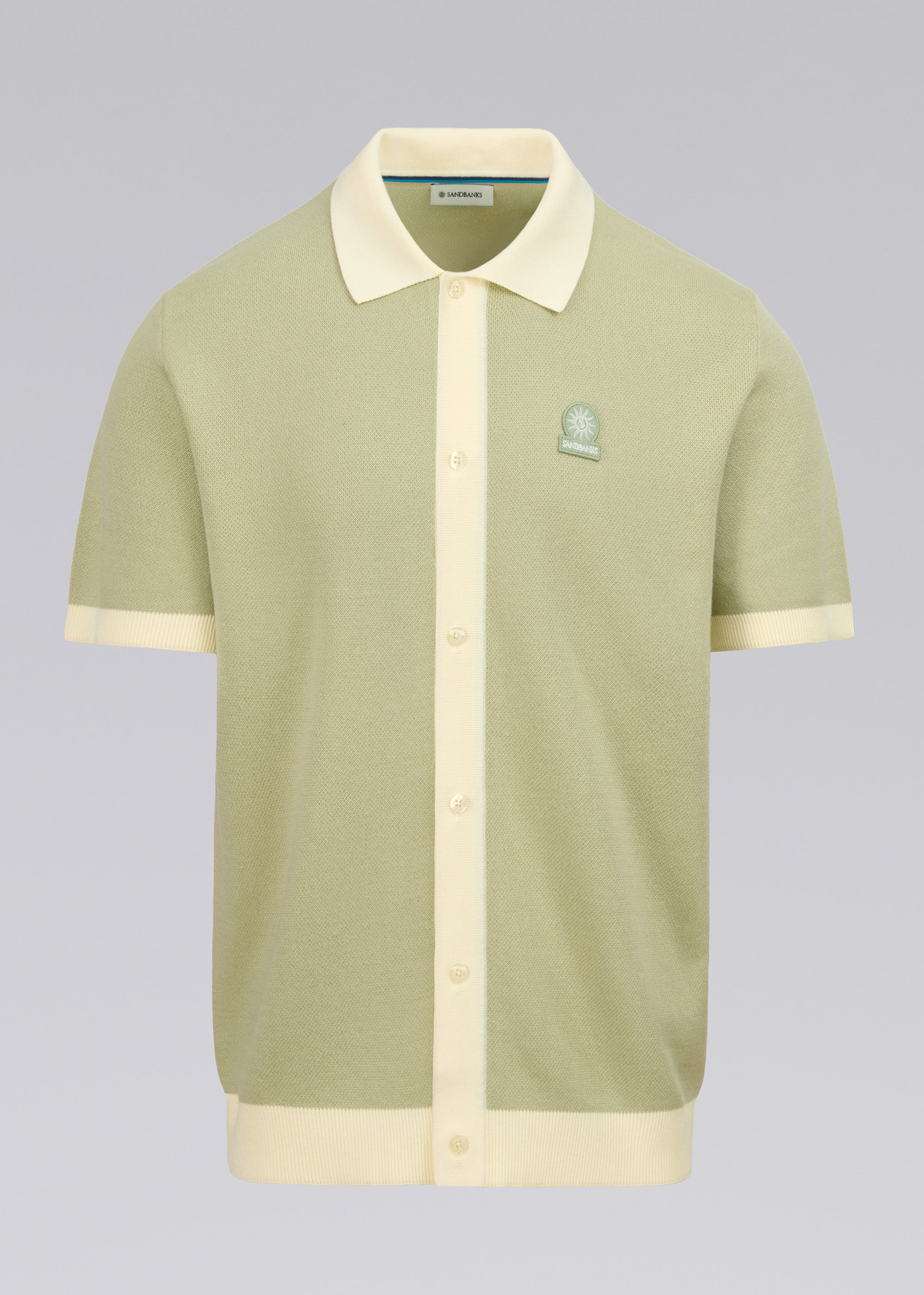 Sandbanks men's fine gauge knitted full button polo shirt in sage with contrast ribbed collar, placket, cuffs and hem in off white. This knitted shirt is made from 100% organic cotton and features a full button placket and Sandbanks embroidered badge.