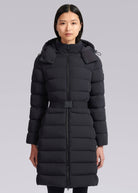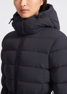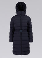 Sandbanks women's belted mid puffer in navy, a lightweight recycled natural down filled puffer jacket made from a lustrous soft shell 4-way stretch water resistant fabric. This jacket benefits from a removable zip off hood, cosy fleece lined pockets and elasticated belt with metal laser engraved clasp in a rubberised finish.