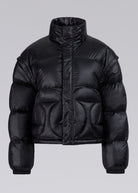 The Sandbanks Women's Monogram Cropped Puffer/Gilet jacket is featured with a black shiny shell fabric, with removable sleeves transforming into a statement gilet. This jacket features shiny black engraved components, branded tonal elastic, contrast felt badge with rubber logo badge, fleece lined pockets and Sandbanks Monogram baffles.