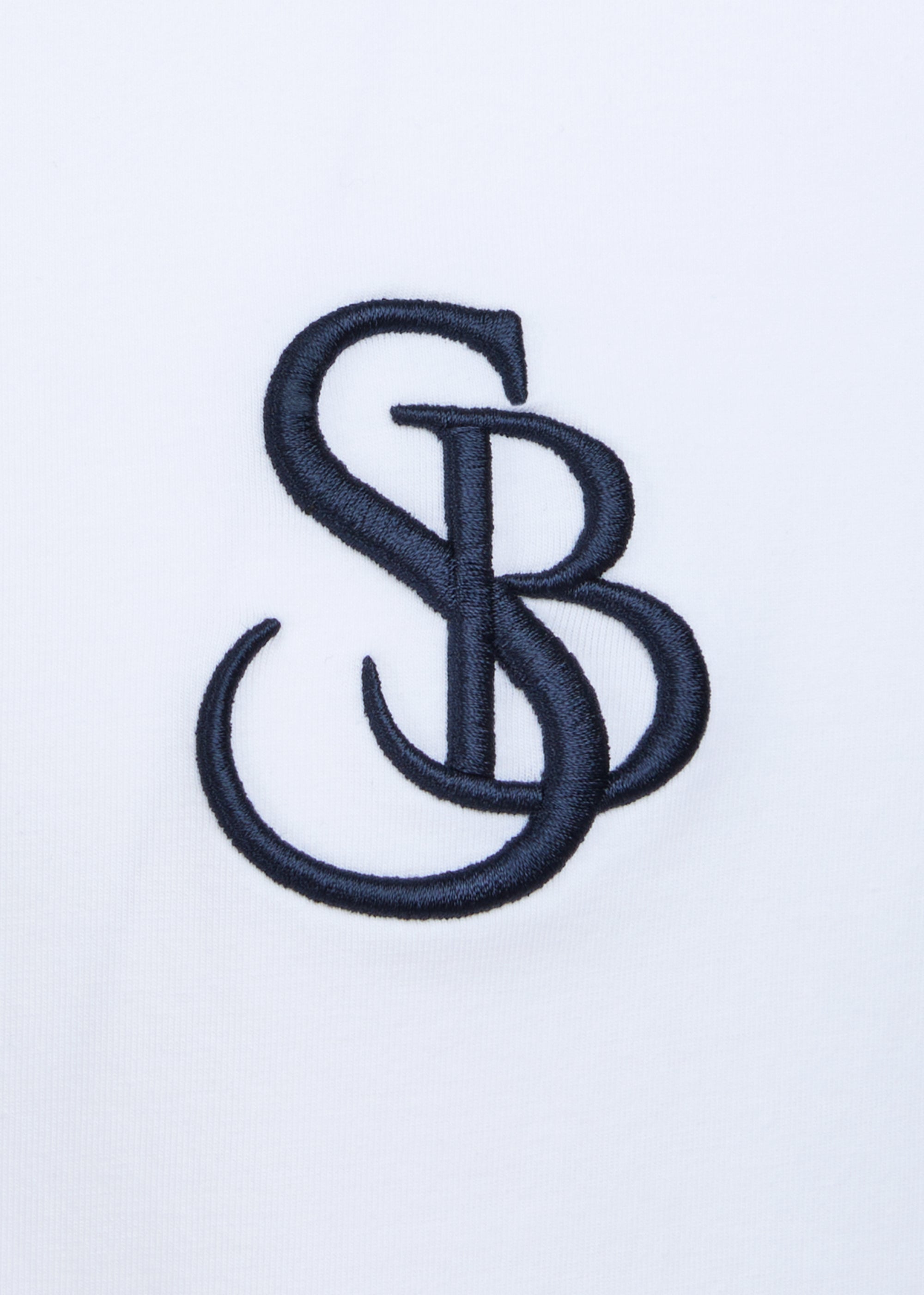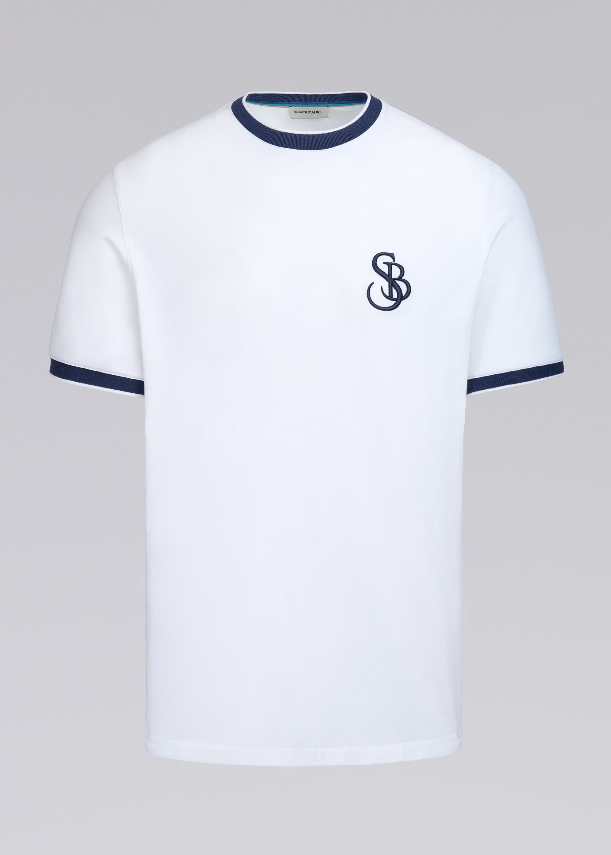 Crafted from 100% BCI cotton, the white Sandbanks SB Ringer T-Shirt has a relaxed-fit crew neck design featuring distinctive navy ribbed collar and cuffs, complemented by sophisticated 3D SB embroidery on the chest.