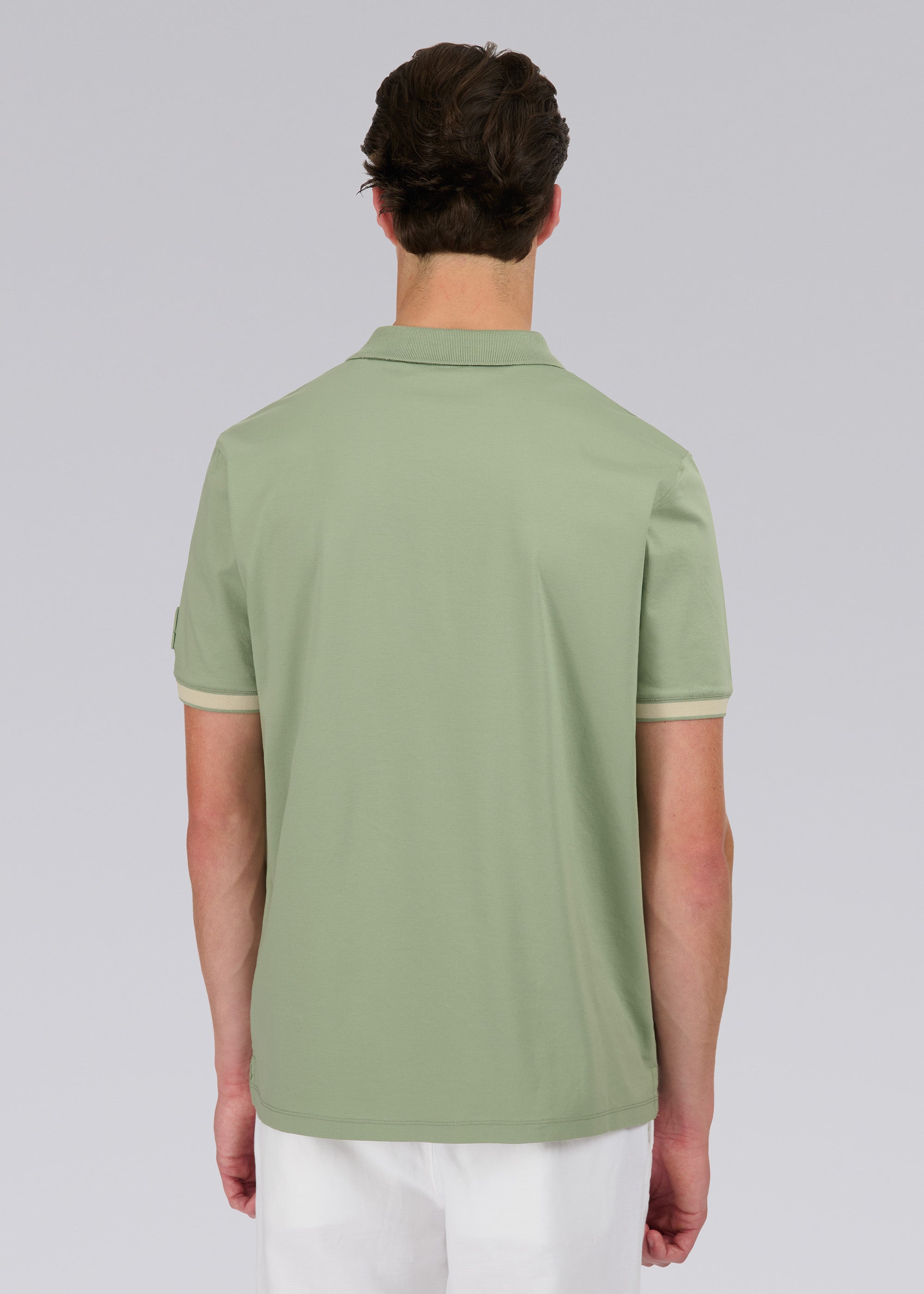 Sandbanks men's silicone zip polo shirt in sage, made from 100% mercerised interlock cotton. This classic fitting polo shirt features a central Lampo silicone zip in stone with tonal logo print, sandbanks rubber logo badge on sleeve, stone striped knitted cuffs and tri-colour back neck binding.