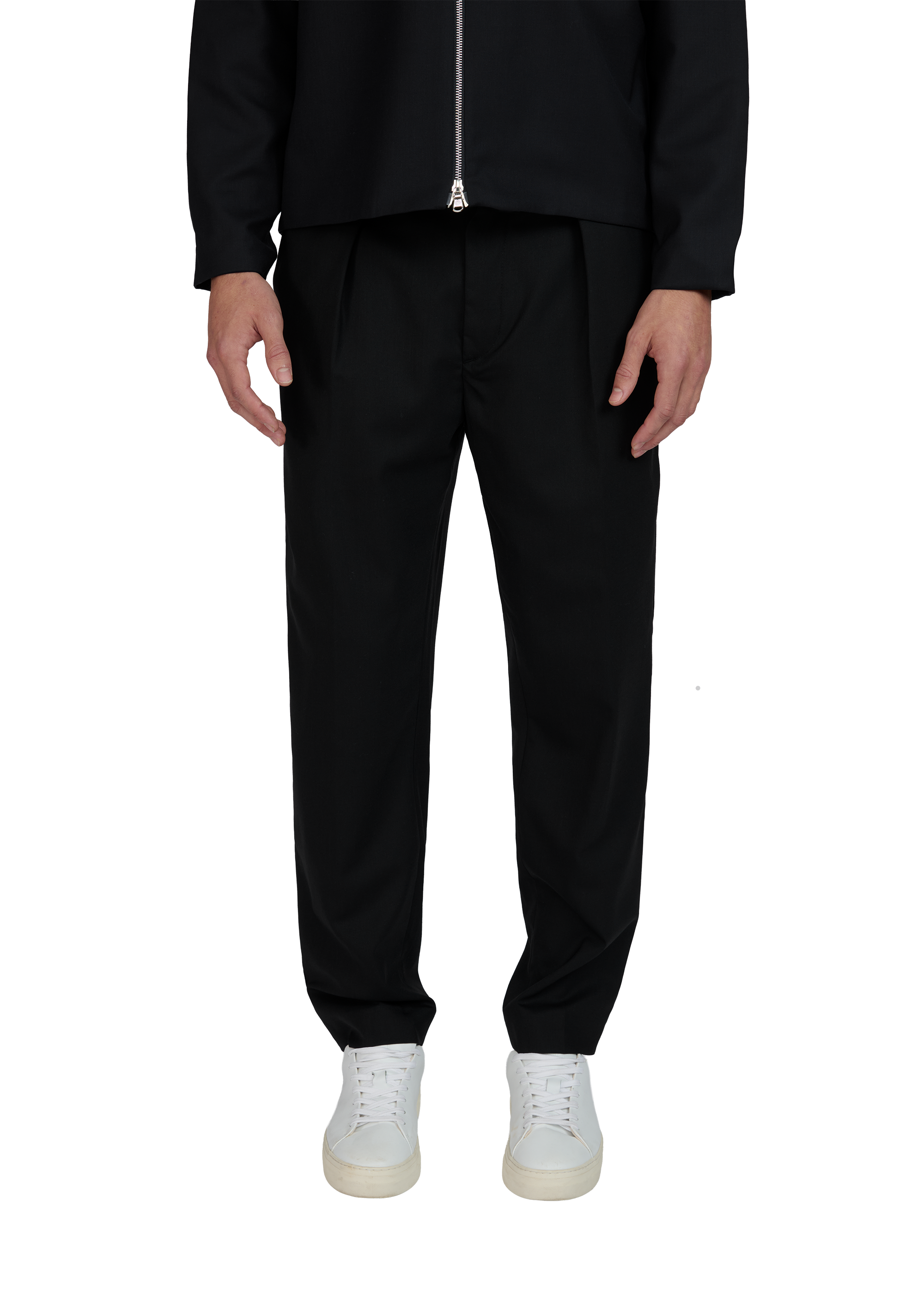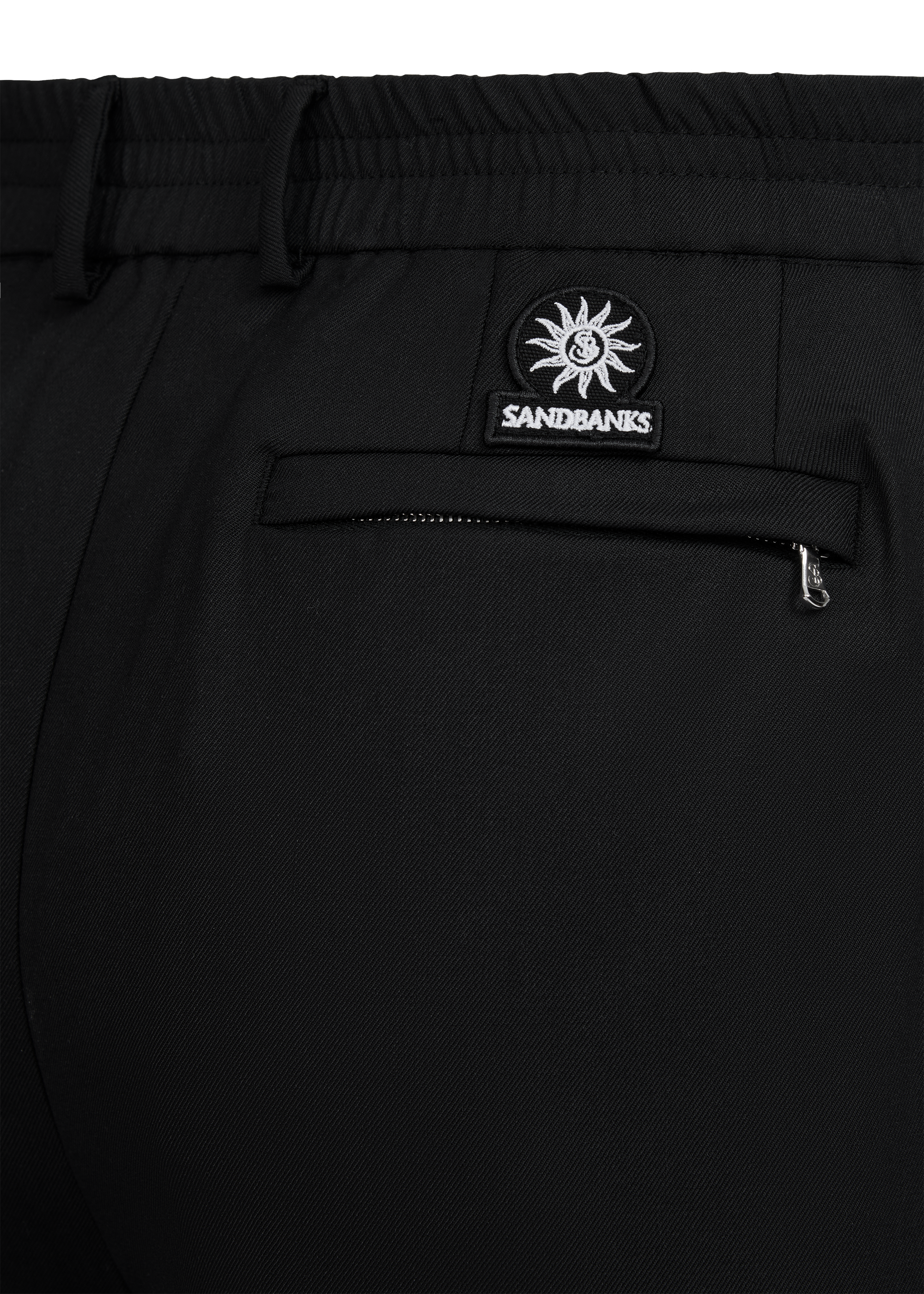 Sandbanks Pleated Trouser in black. Crafted from a premium, crease-resistant wool blend, these smart trousers deliver superior comfort and durability. Cut with a mid-rise and a relaxed leg, they offer a streamlined silhouette, defined by a clean pleat detail. Finished with a smooth satin lining, a half-elasticated waistband with belt loops, and three functional pockets. The design is completed with our signature badge logo for a distinctive finish.